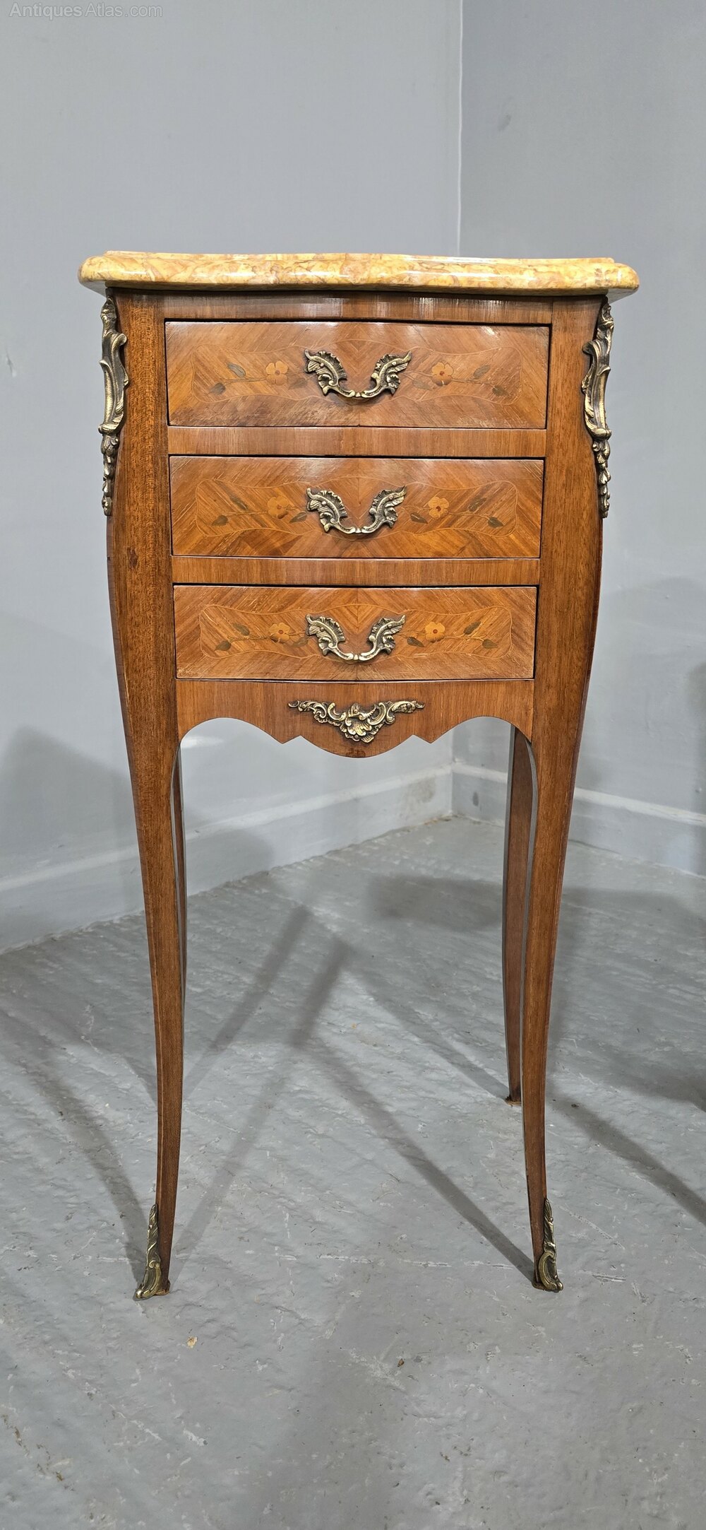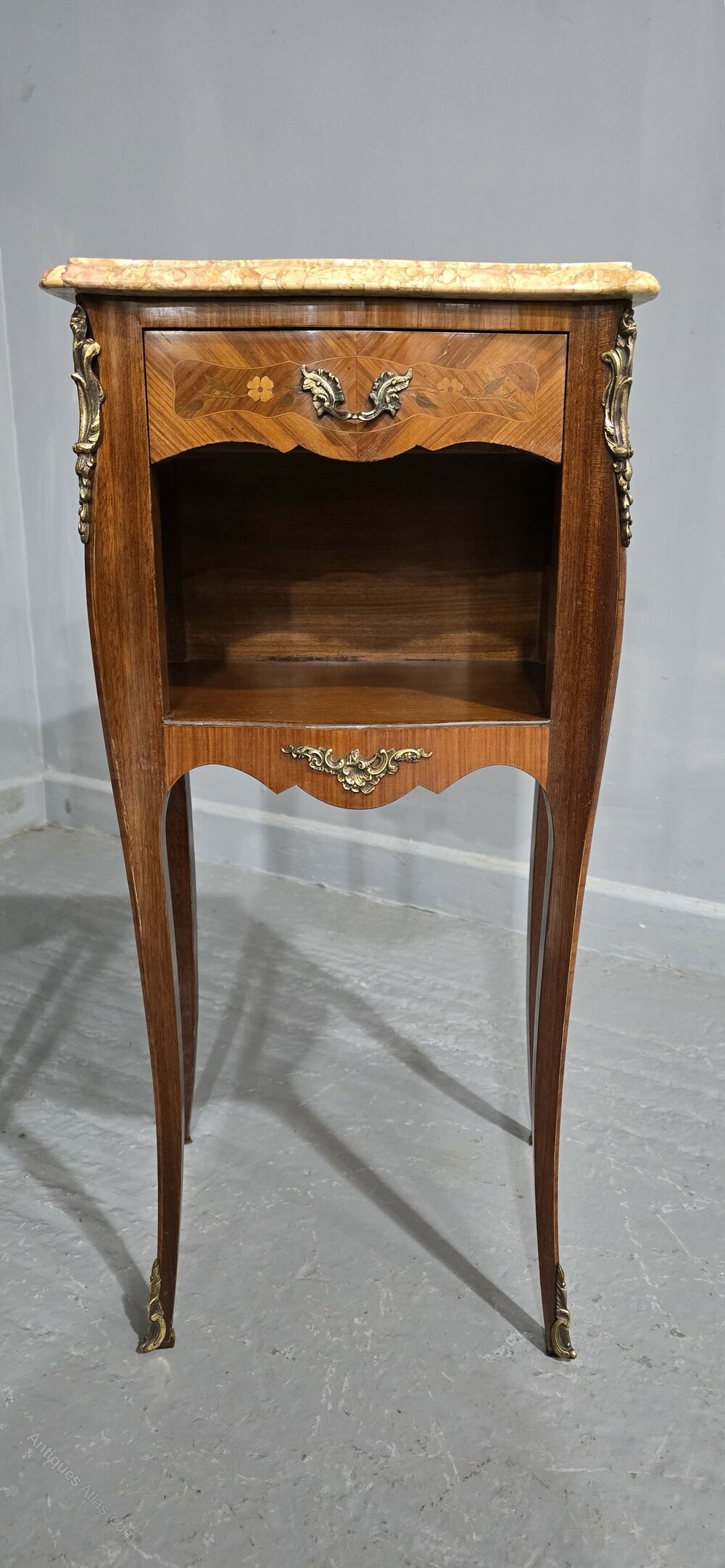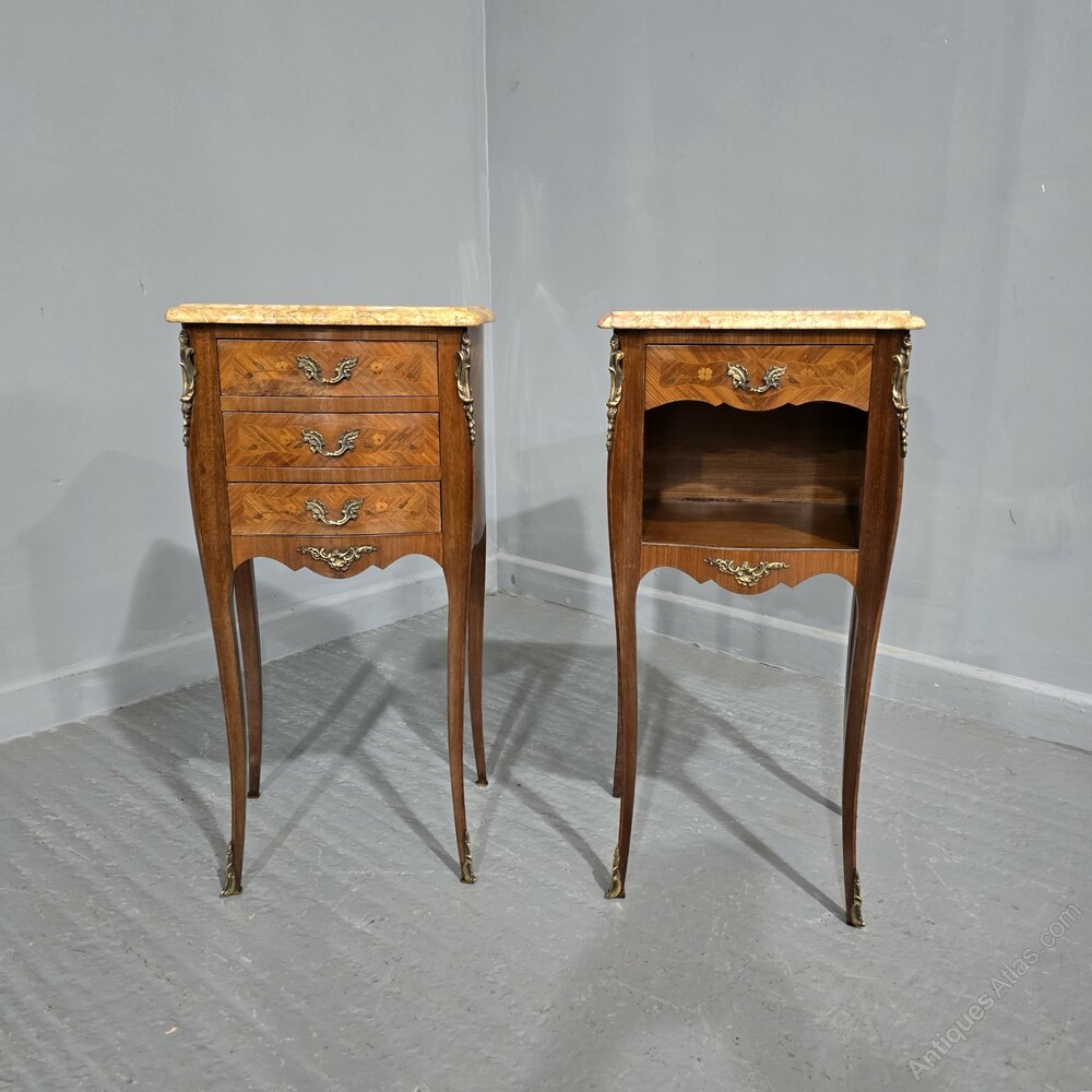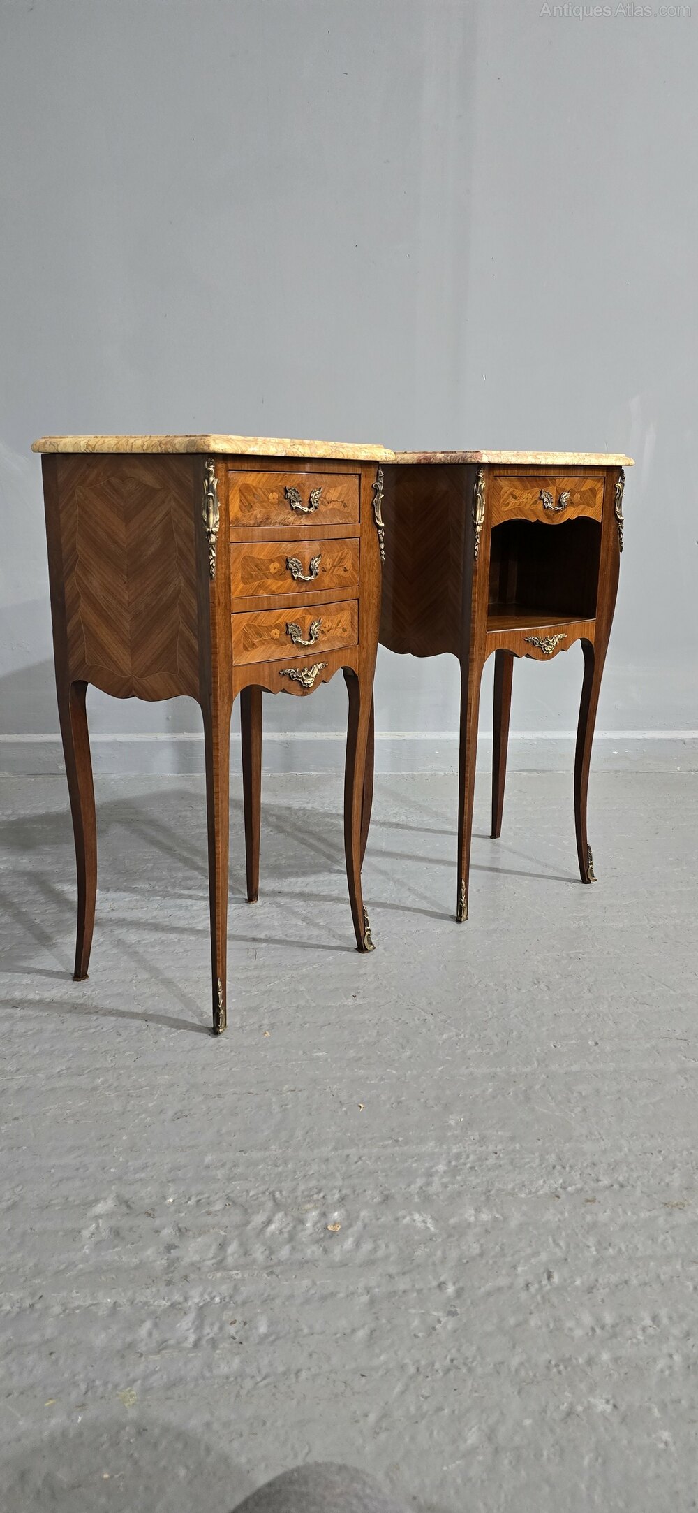 Excellent quality pair of French marquetry bedside chest of drawers, slim legs with ormolu feet, ormolu handles and stunning marble tops, overall super colour.