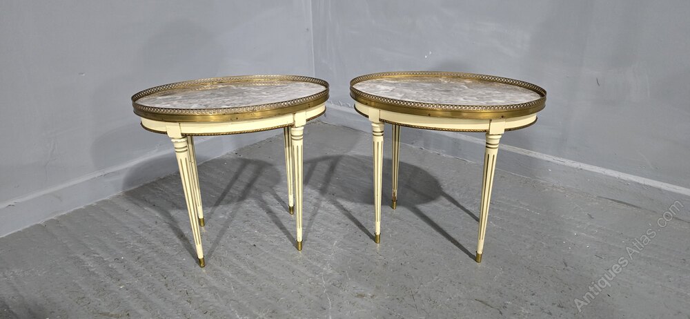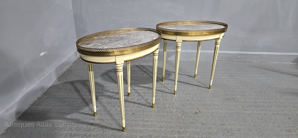 A good pair of French painted lamp tables with grey verigated marble tops surrounded by brass galleries, brass tipped legs, in overall very good condition.