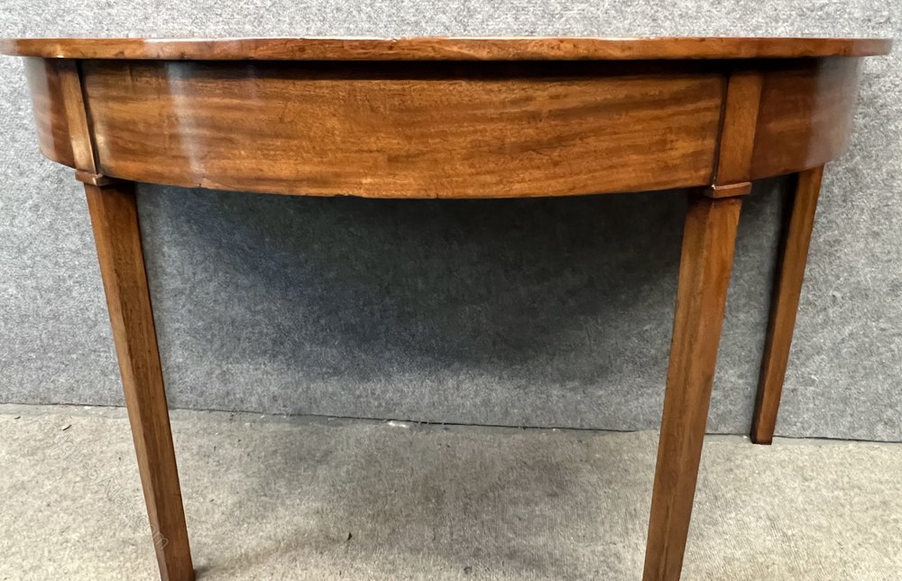 A pair of George III mahogany Demi lune console antique tables, the solid mahogany tops above the cross banded friezes and joining the square moulded edge legs. Condition very good, re-polished in our own workshops. Dimensions:- Height…29’’/ 74cm. Width…51.75’’/ 131.5cm. Depth…25’’/ 63.5cm. Delivery to most of U.K. mainland £55.