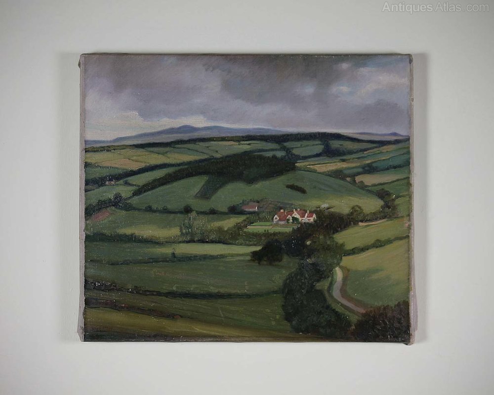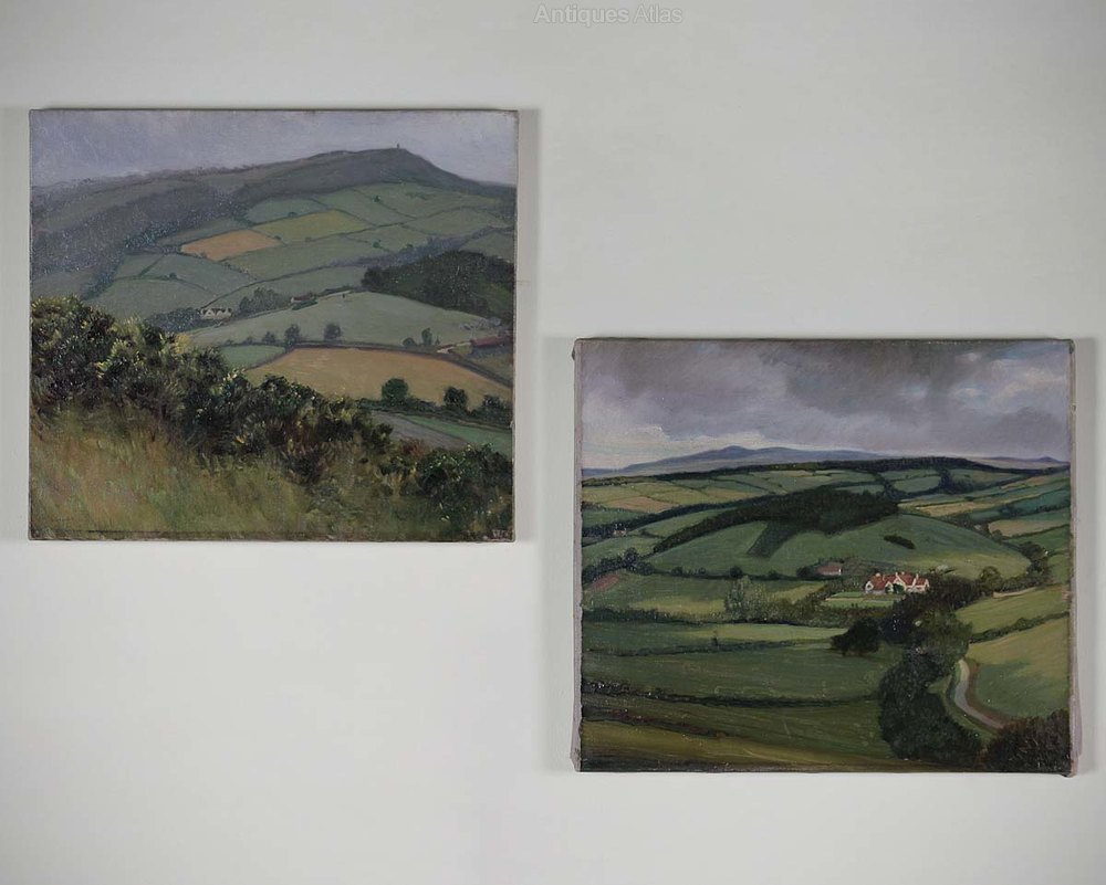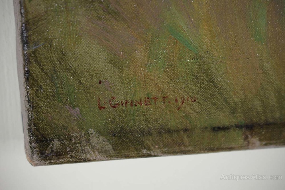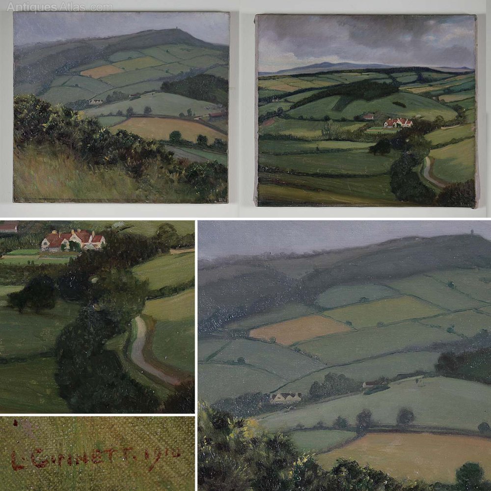 Charming pair of Edwardian era landscapes by the English painter Louis Ginnett (1875-1946). In oil on canvas, depicting the rolling, lush green landscape around Westhope in Shropshire. Both are signed in the lower left hand corner and dated 1910. Excellent condition, presented unframed on the original stretchers.