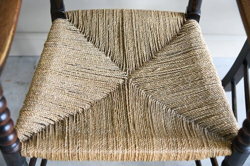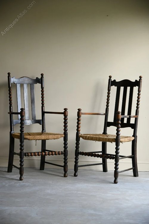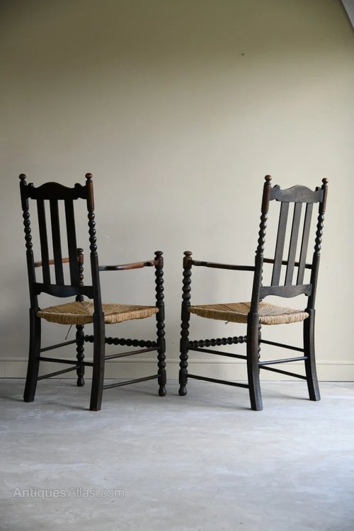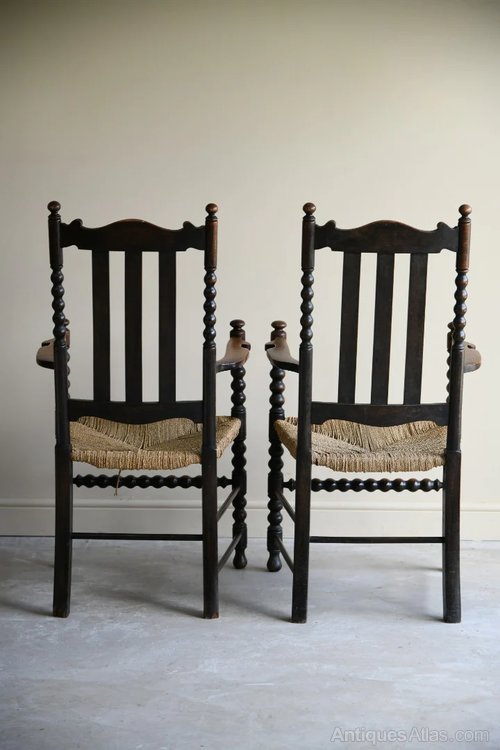 Pair Bobbin Chairs. Early 20th Century stained oak and beech carver chairs, slat back, open arms, woven seagrass seats on bobbin turned supports.