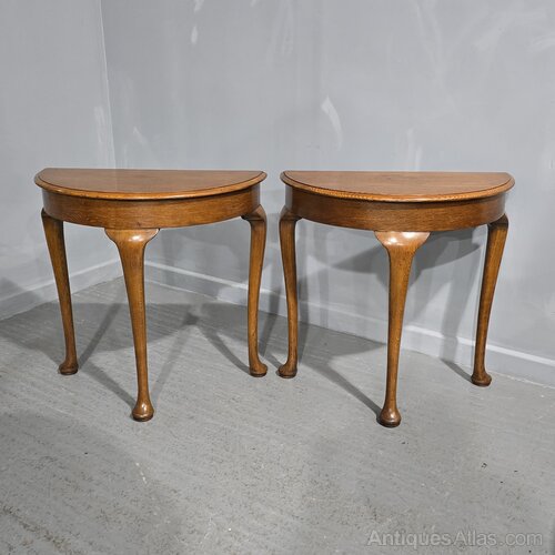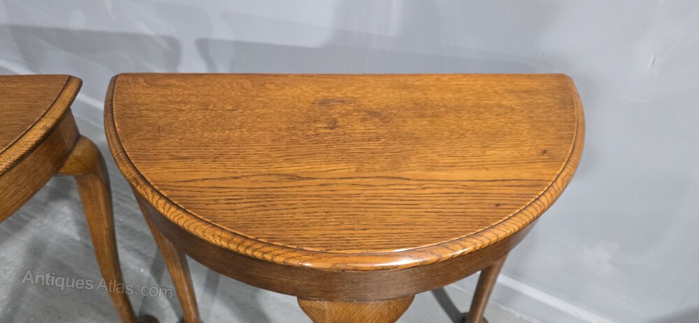 A super pair solid golden oak demi lune console tables, standing on tall cabriole legs, and in overall very nice original condition.
