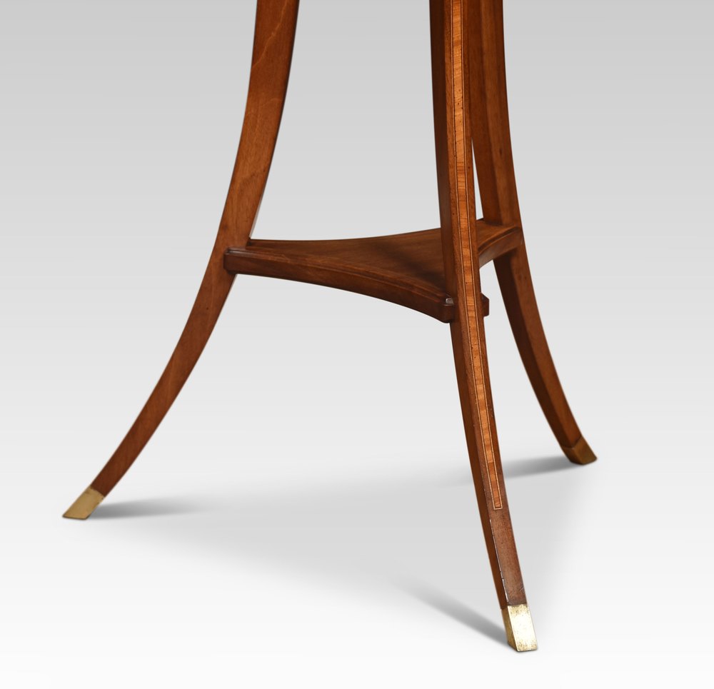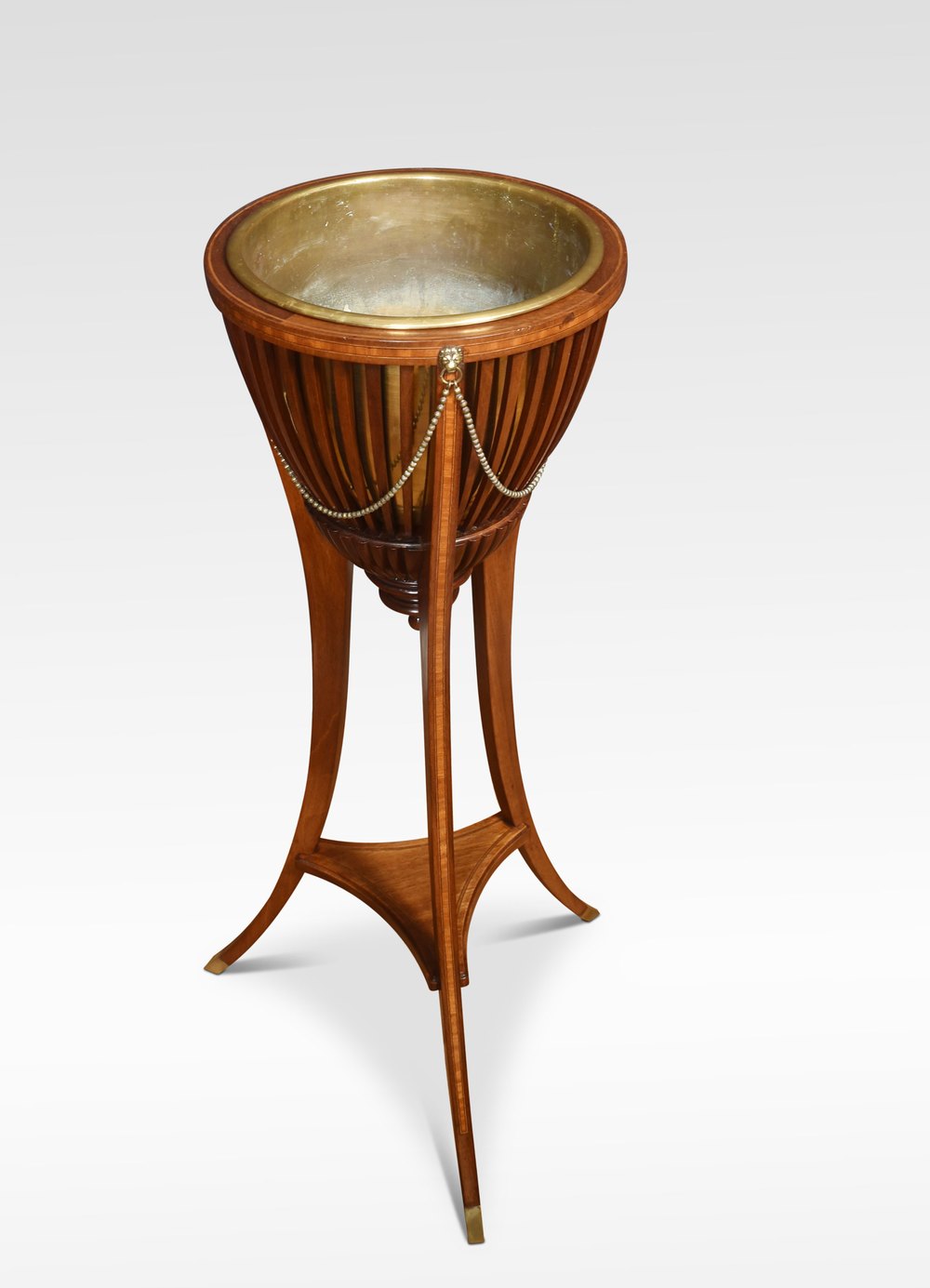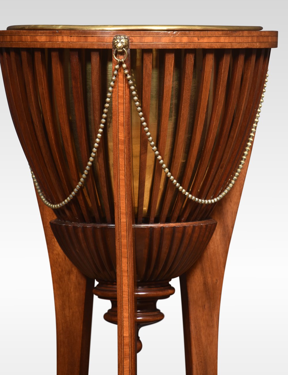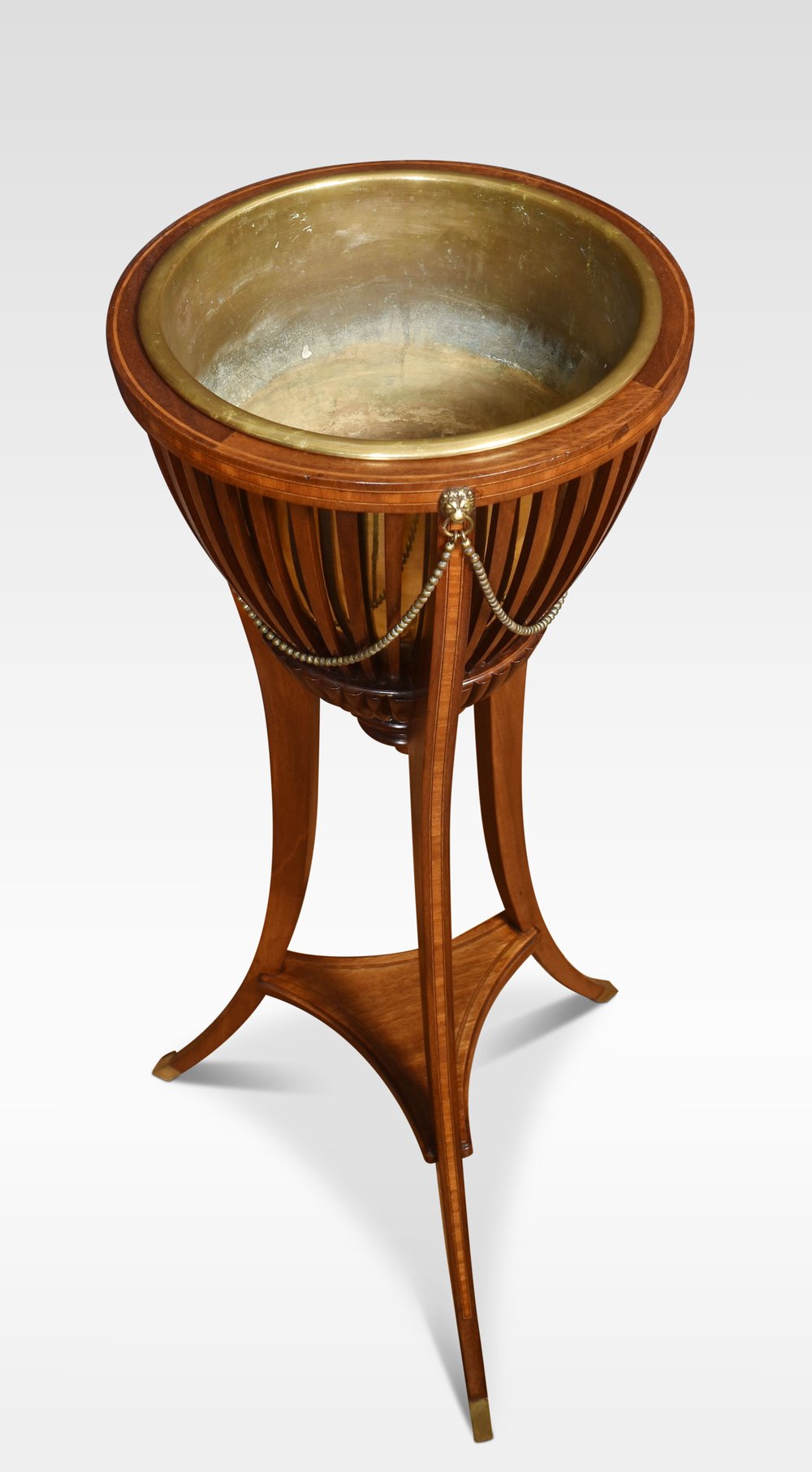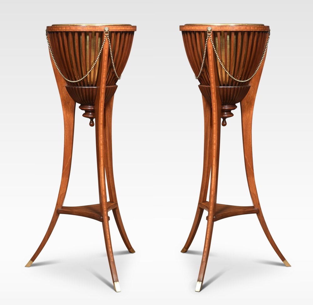 A pair of inlaid mahogany plant stands of circular form retaining the original brass liners, enclosed in mahogany spindle frame with brass lion mounts raised on three splayed supports, united by undertier.