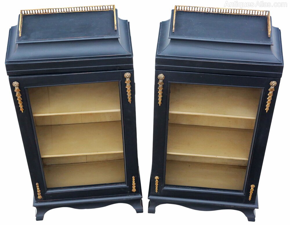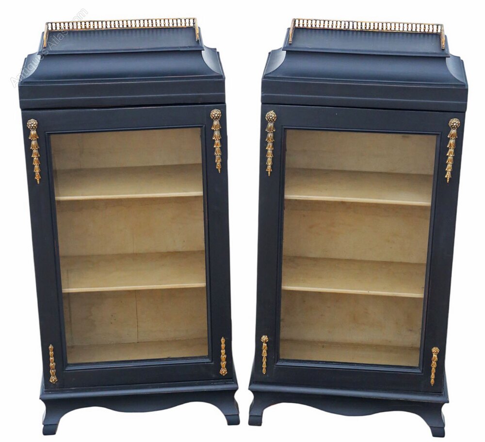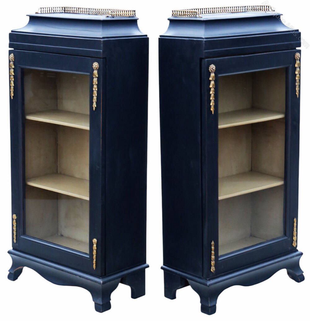 A fine quality 19th-century matching pair of painted pier display cabinets / bookcases, attractively repainted in black. With their elegant form and decorative appeal, these cabinets offer both period charm and practical storage. Complemented with ormolu brass galleries and mounts, they could also make a fantastic pair of small bookcases.