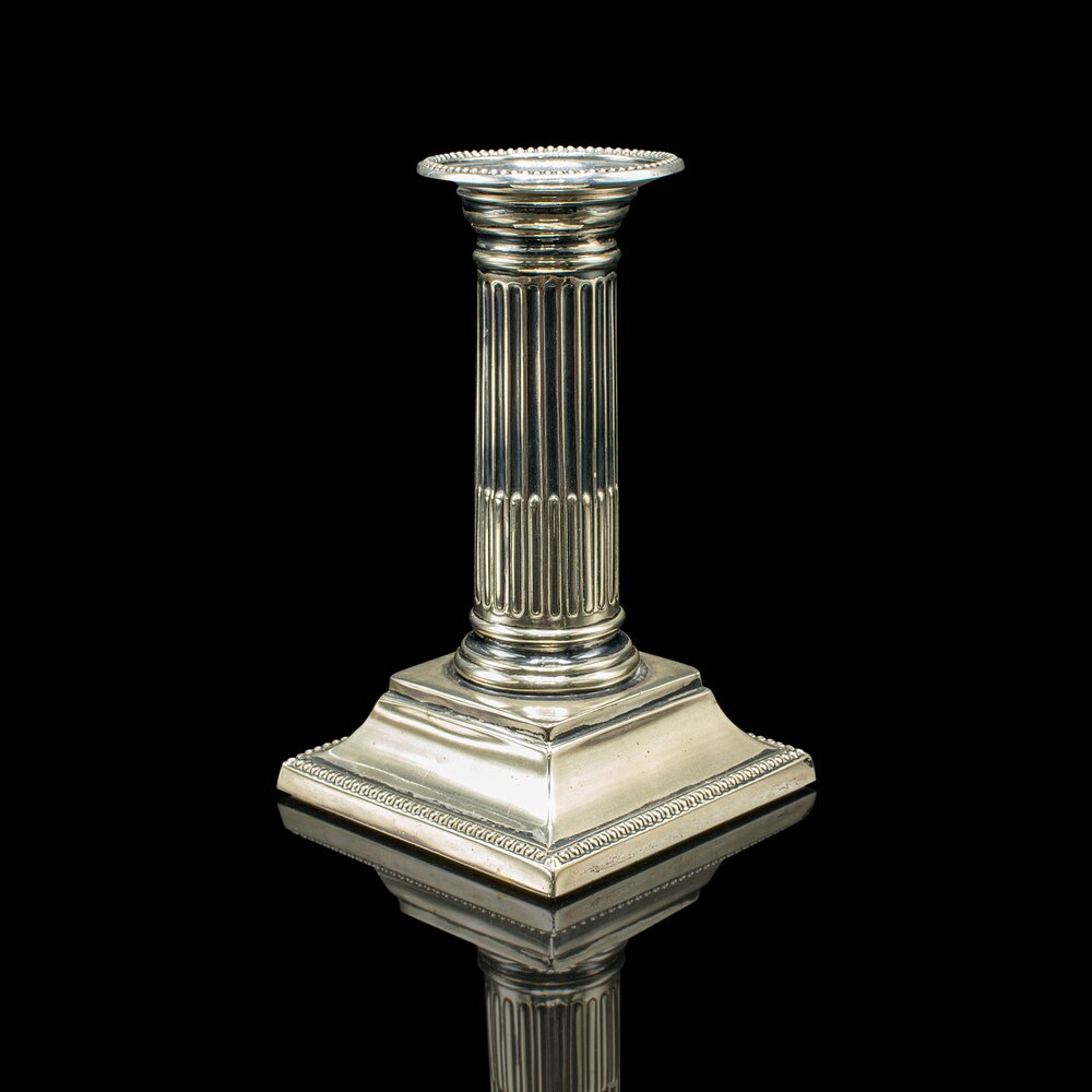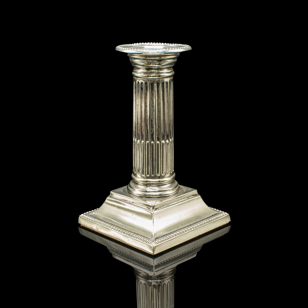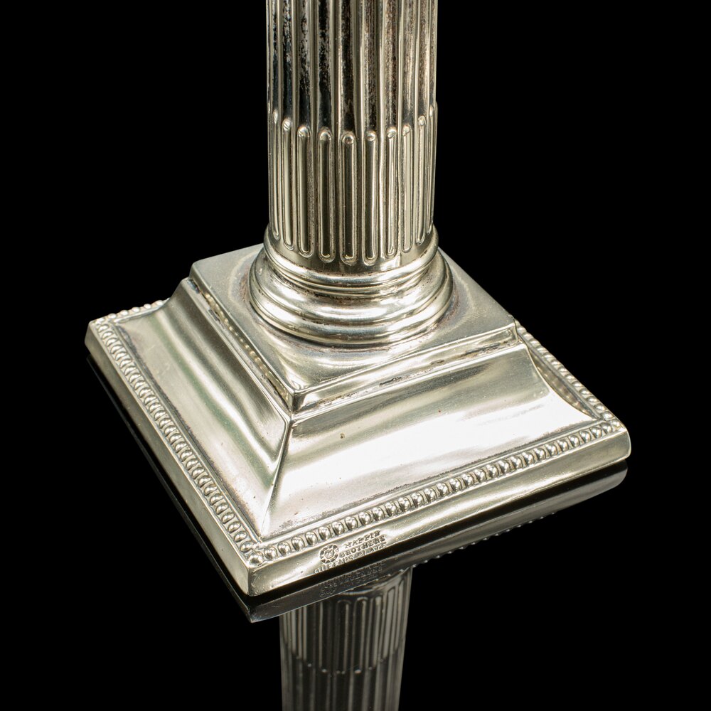 This is a pair of antique candlesticks. An English, silver plated candle stands, dating to the late Victorian period, circa 1900.