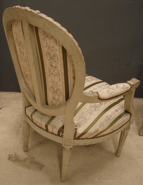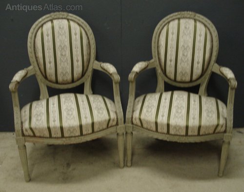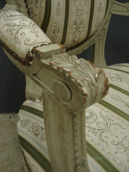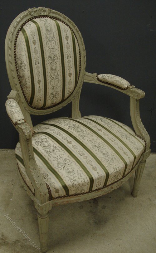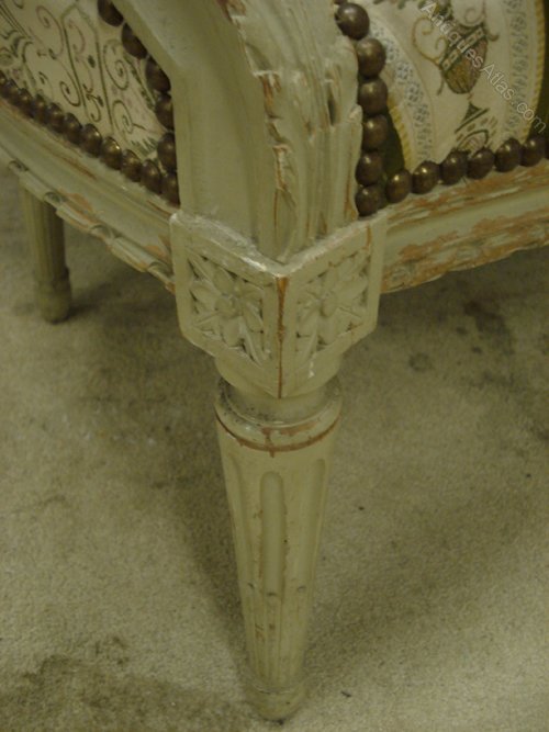 Ref 5386 - Pair of worn pale grey/green painted reupholstered Louis XVI style antique French armchairs. Circa 1900.
