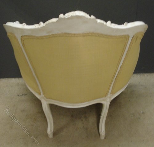 Ref 6195 - Pair of French Louis XV style worn white painted carved wood antique armchairs. Ready for recovering. Some marks and stains to fabric. Circa 1900.