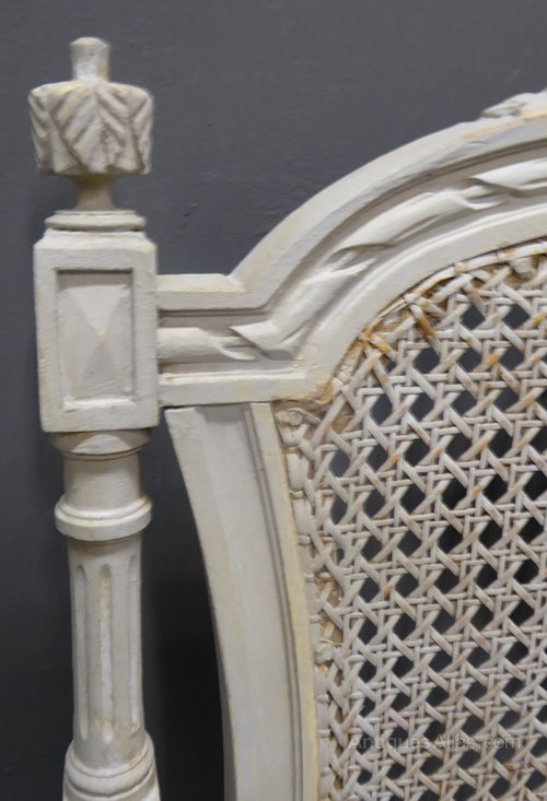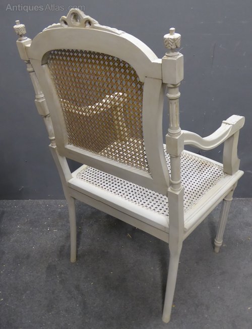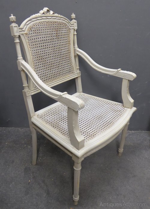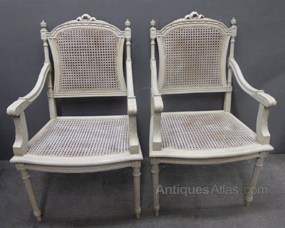 Ref 7141 - Pair of antique French worn grey painted Louis XVI style armchairs with cane panels. Circa 1900.