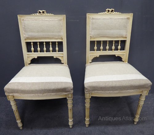 Ref 6697 - Pair of French worn cream painted Louis XVI style side chairs. Circa 1900.