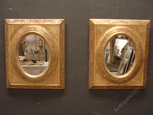 Ref 4645 - Pair of Antique French Mirrors - Pair of small gilt oval mirrors in gesso decorated frames. Fitted with mercury glass. Circa 1900.
