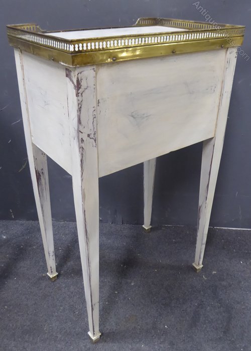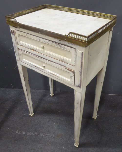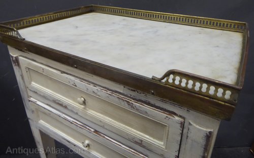 Ref 7258 - Pair of worn white painted Louis XVI style antique French two drawer bedside cabinets with inset marble tops and brass gallery. Circa 1900.