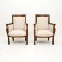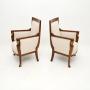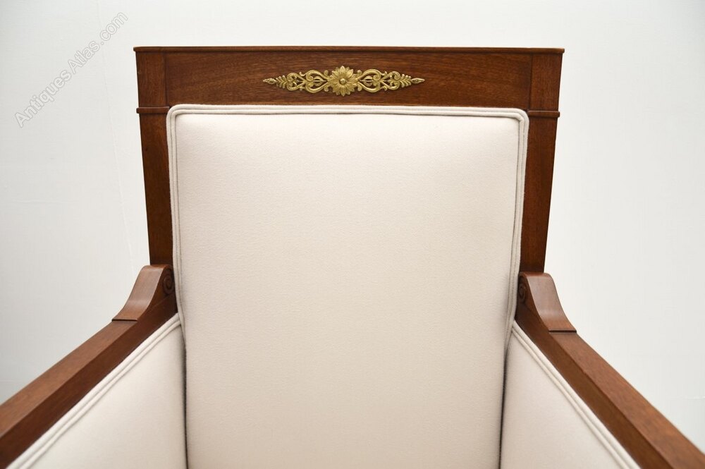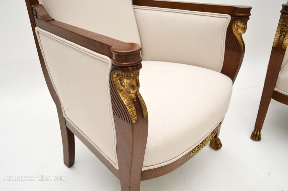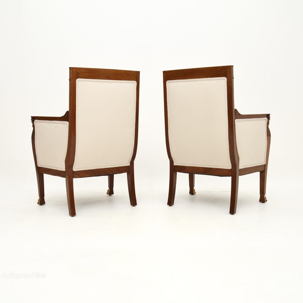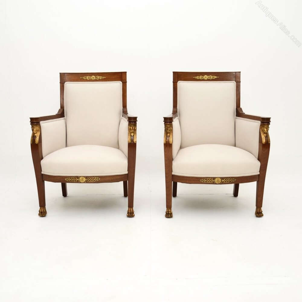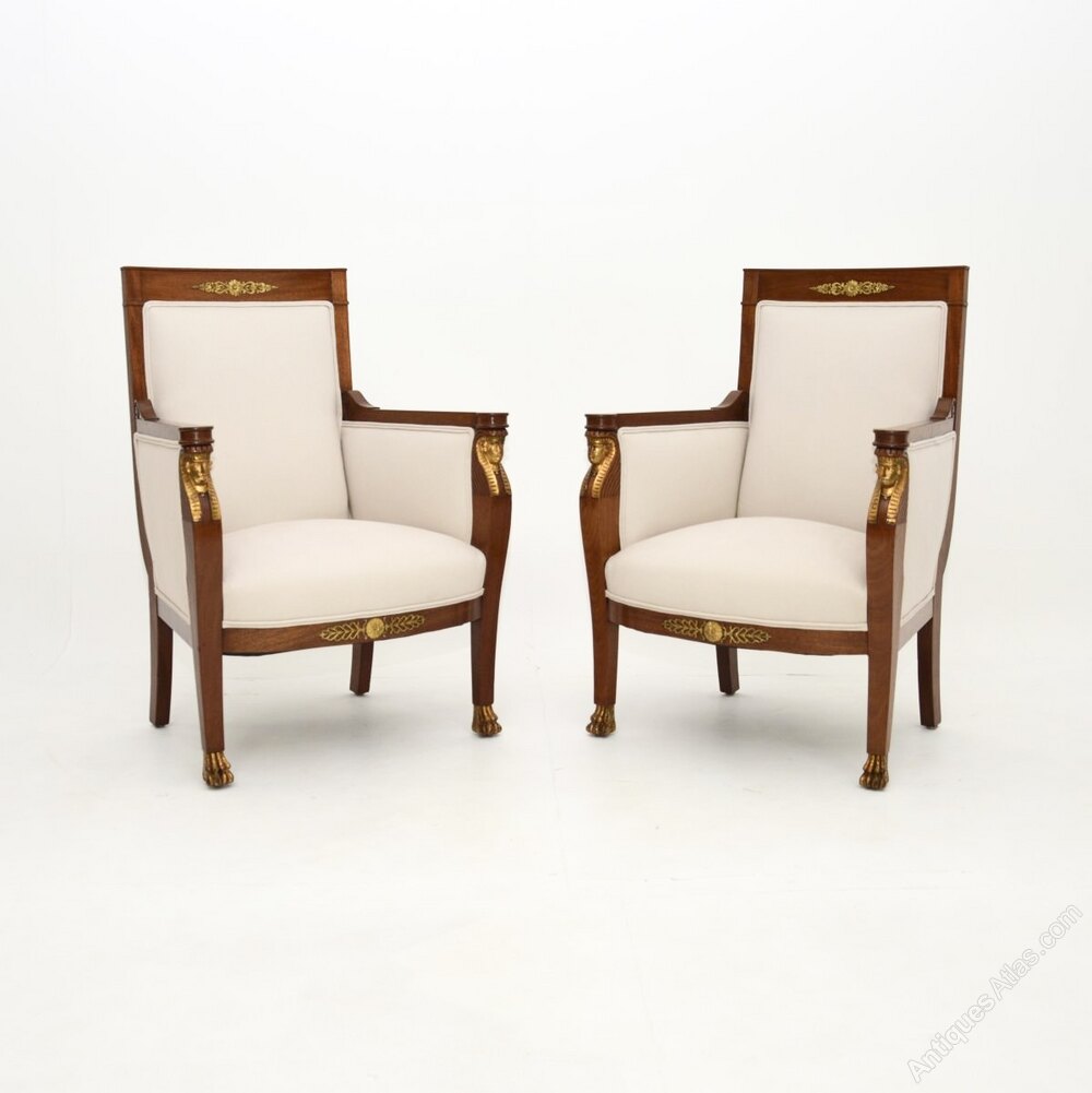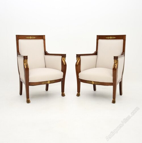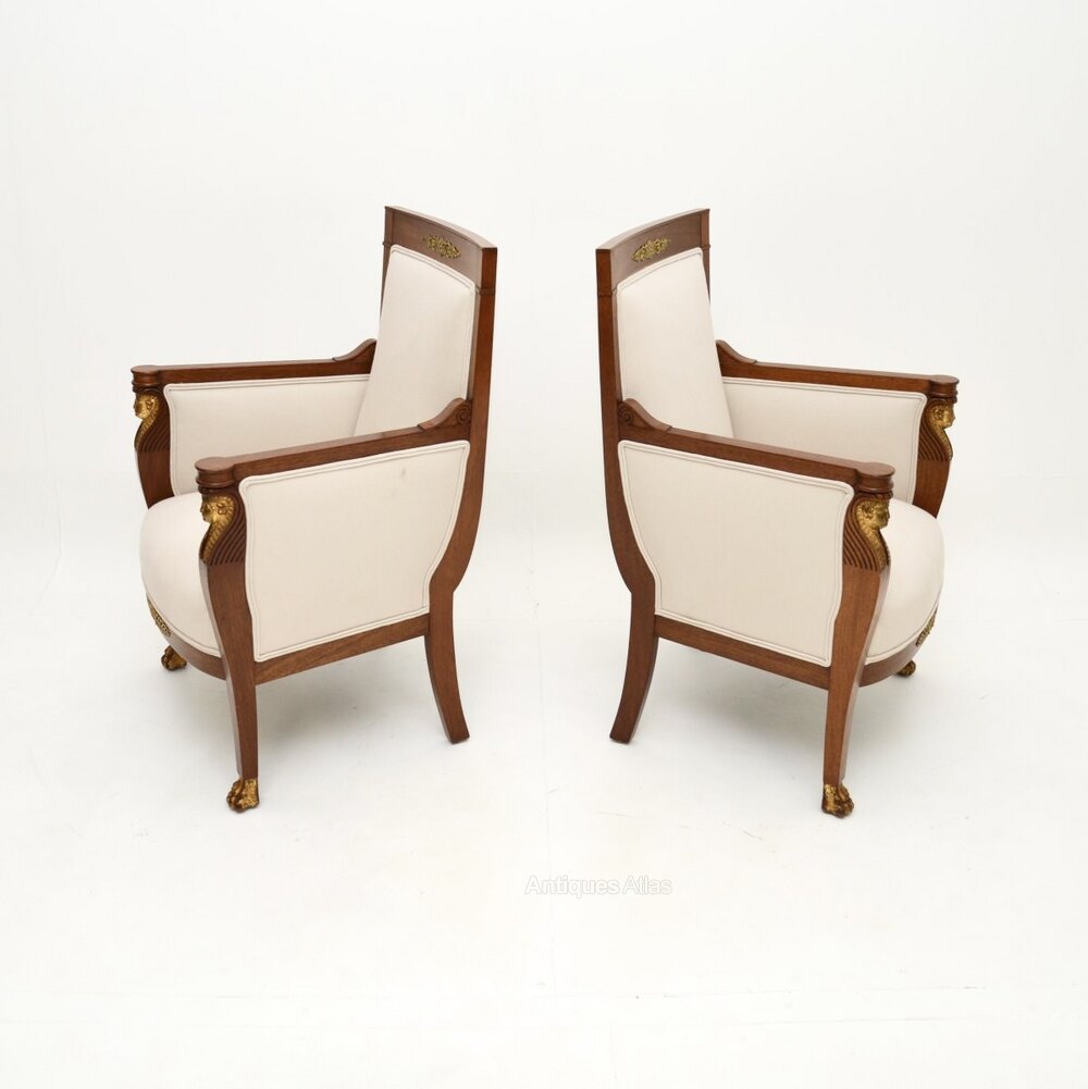 The quality is outstanding, and they are of lovely proportions. The solid mahogany frames are beautifully carved, with Egyptian inspired heads on the arm rests and hairy paw feet, both of which are beautifully gilded. The have very high quality ormolu mounts on the lower edges of the seats and the upper edges of the back rests.