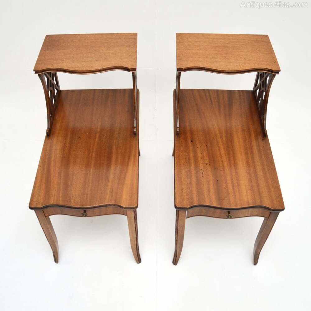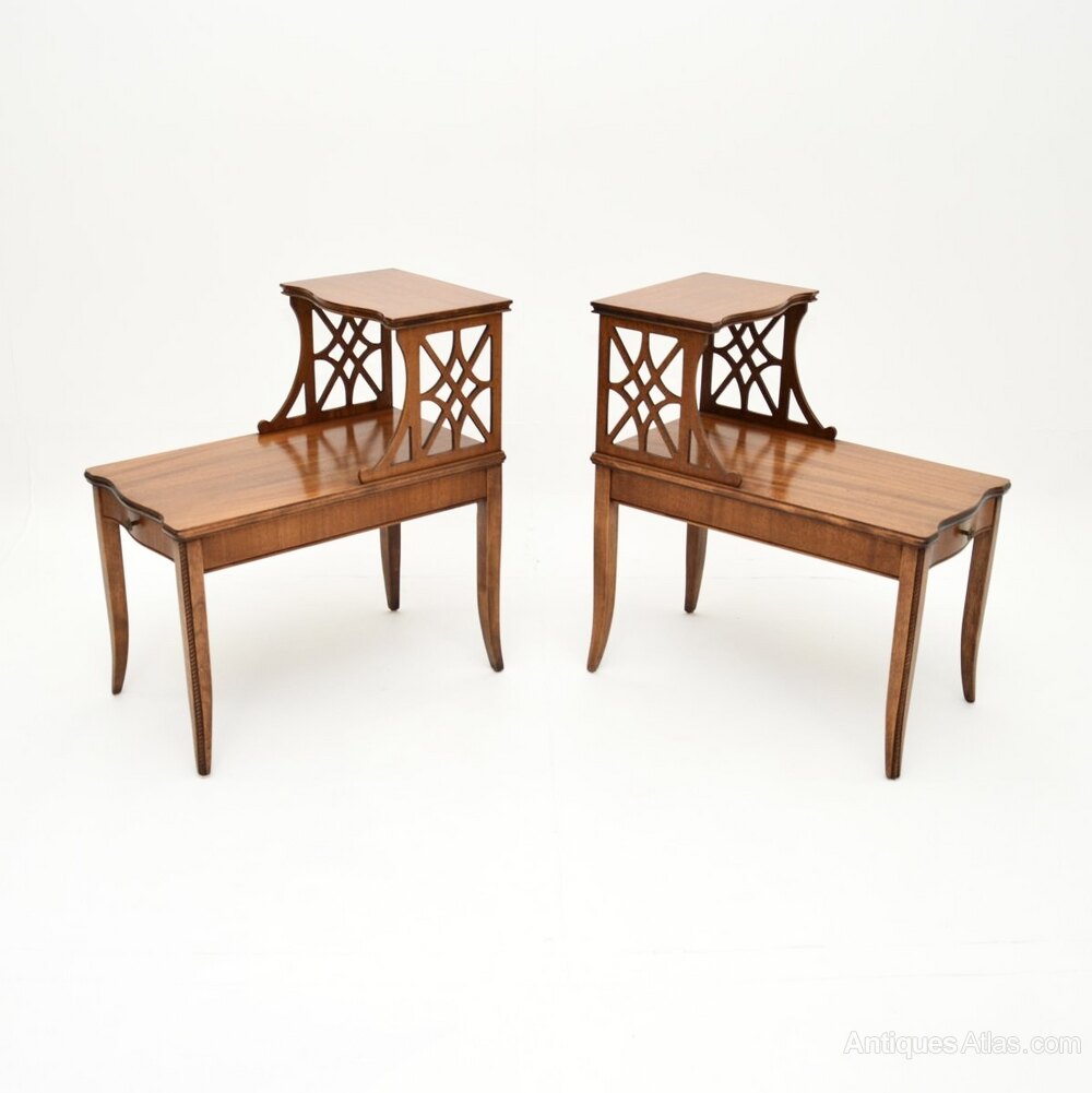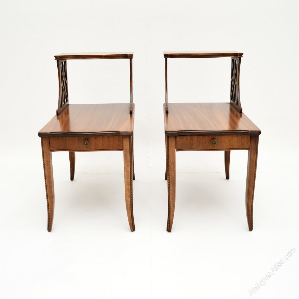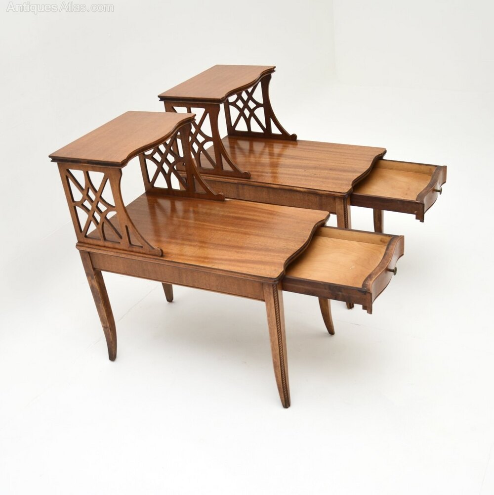 The quality is excellent and they are a very useful size. They are quite narrow and deep, perfect for use as lounge tables either side of a sofa, or even as bedside tables. Each stands on beautifully shaped legs with beaded edges, and have a single drawer. They have a recessed upper tier, with beautifully pierced fretwork supports.