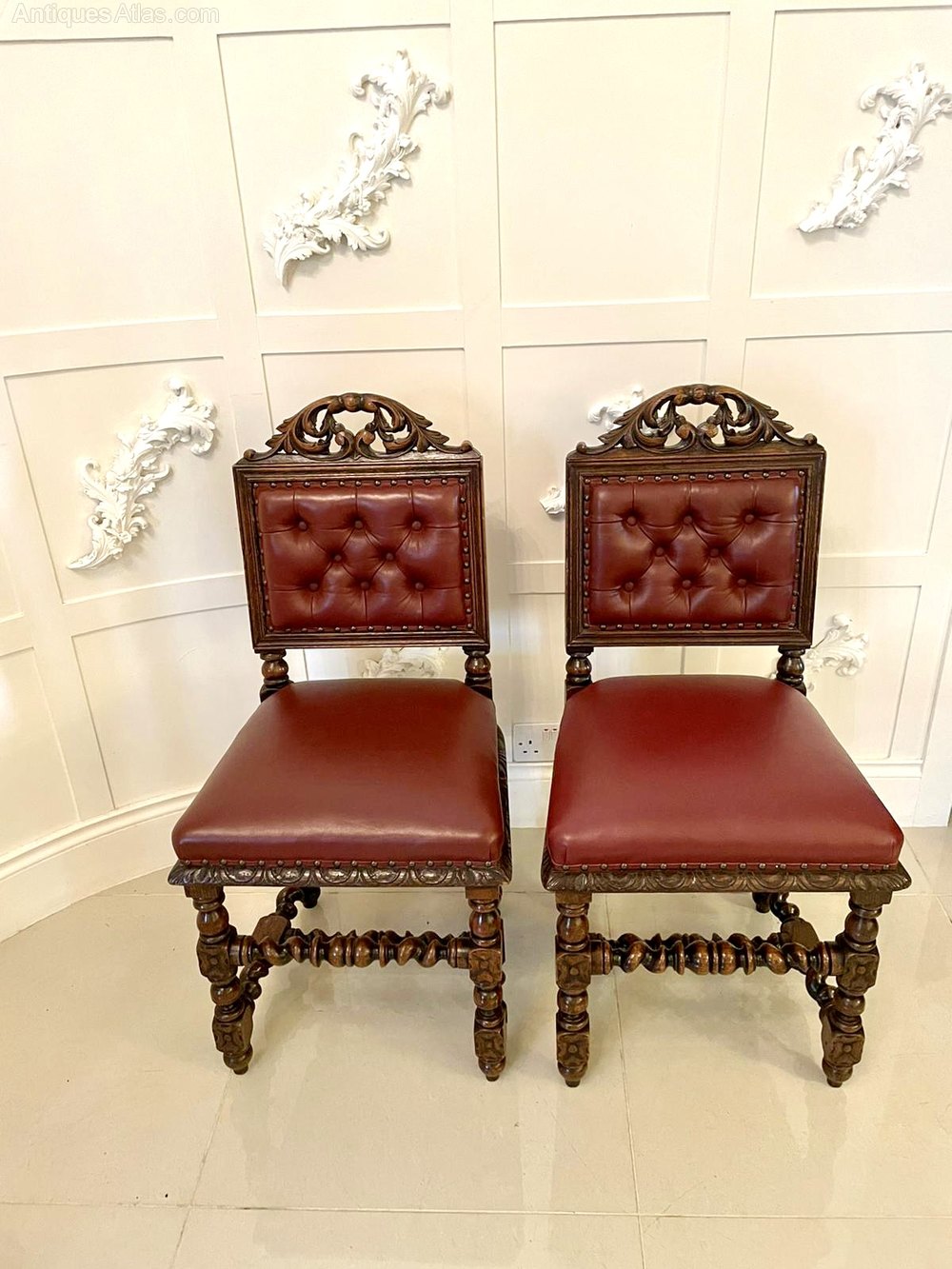Quality pair of four antique Victorian carved oak side/desk chairs having a quality carved oak top rail above a moulded panel with newly reupholstered buttoned backs and seats in burgundy leather. They boast a marvelous carved frieze and stand on carved turned legs to the front and barley twist legs to the back. Raised on turned feet and united by barely twist stretchers.