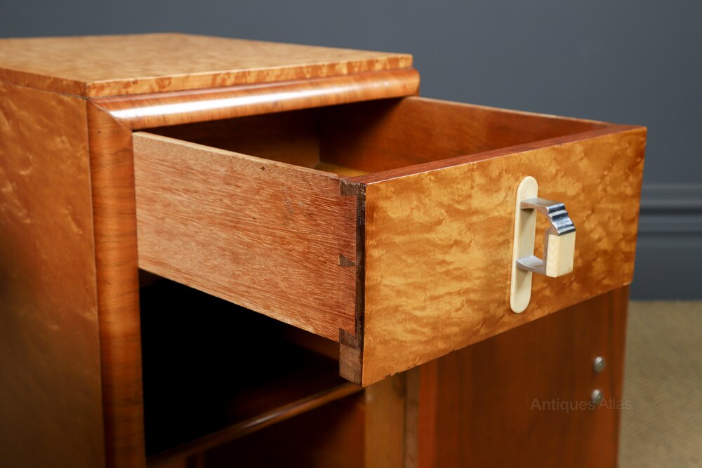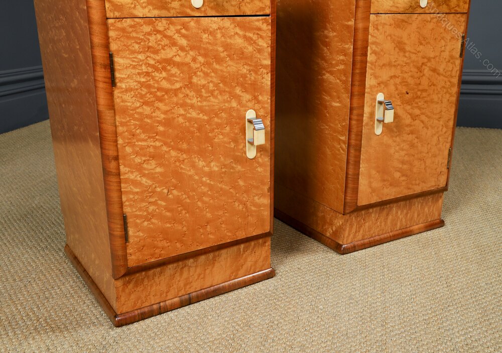 This is a fine quality pair of antique English Art Deco bedside cupboards, constructed from stunning mirror-matched birds eye maple and walnut, with a single drawer above a cupboard, circa 1930, in excellent condition. The pair of Art Deco bedside tables boast decorative birds eye maple timbers, on a solid carcass, with walnut quarter moulded frames and figured walnut sides. The Art Deco bedside chests comprise a single working drawer, each constructed with mahogany dovetail joints, which retain the original cream Bakelite & chrome handles. The drawers run smoothly and close flush to the frame. Below, is a cupboard door, which opens to reveal a large storage area, incorporating a shelf. The cupboard door also incorporates the same original handles. The Art Deco bedside cupboards are designed with an elegant figured walnut quarter moulded frame to the front of the stands and the bedsides are raised on their original recessed plinths.