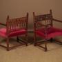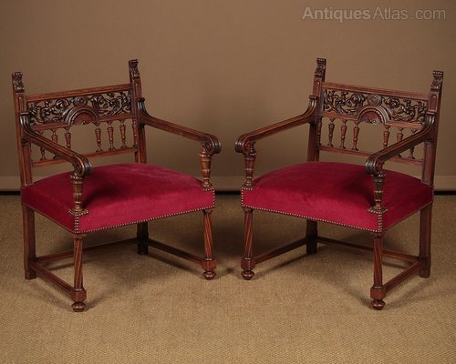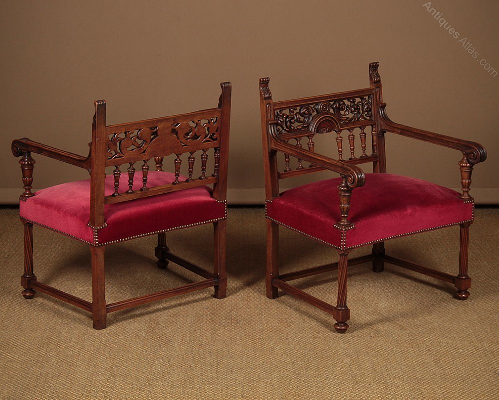Fine pair of late 19th.c. walnut open armchairs c.1880. Low backrests with a crisp carved and pierced foliate backrest with moulded rails over turned spindles between raised rear stiles with acanthus carved corbel tops. Straight moulded arms with scrolling terminals on turned and segmented baluster turned supports. Unusually broad sprung seats recently upholstered in a deep red velvet chenille with brass studs to the edges. Twisting reeded column front legs and turned feet, chamfered edges to the rear legs. Moulded stretchers to the sides and rear for strenth. Excellent colour and condition with clean covers, the frames have been cleaned and waxed in our workshops.