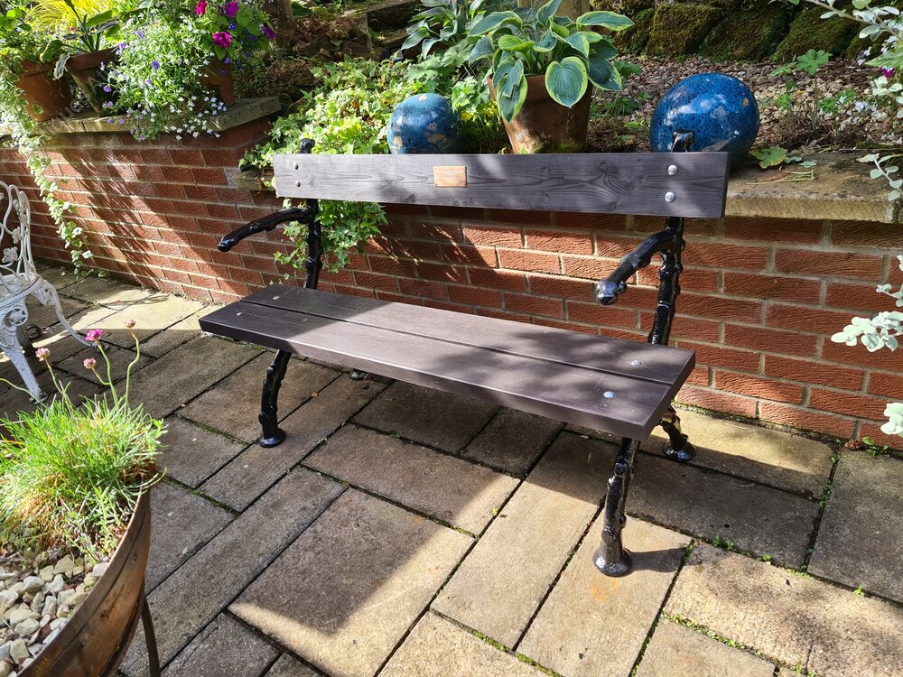 Quality PAIR of 19th Century cast-iron and wood garden benches, both in excellent condition. Complete with romantic brass plaque to each bench (please read). Fully refurbished with new wood and four coats of stain and protection. Delivery available.