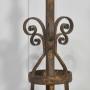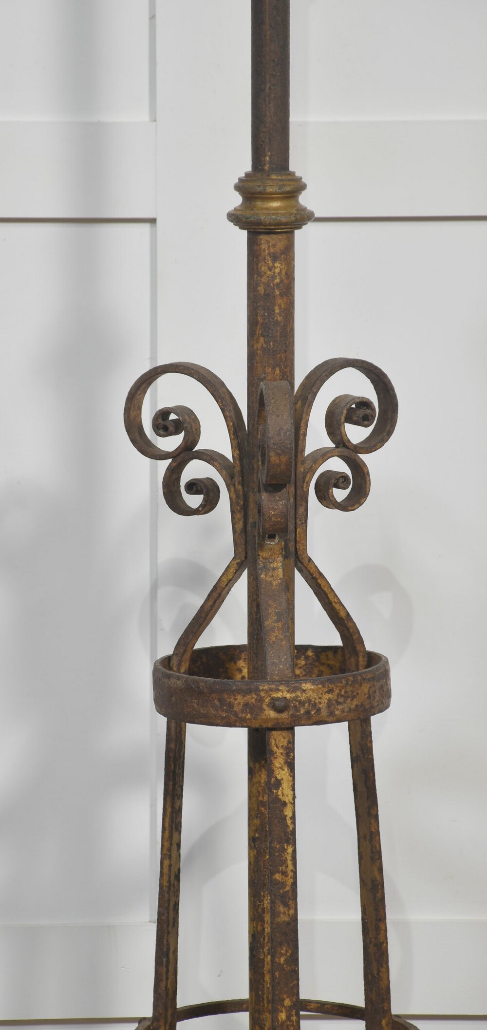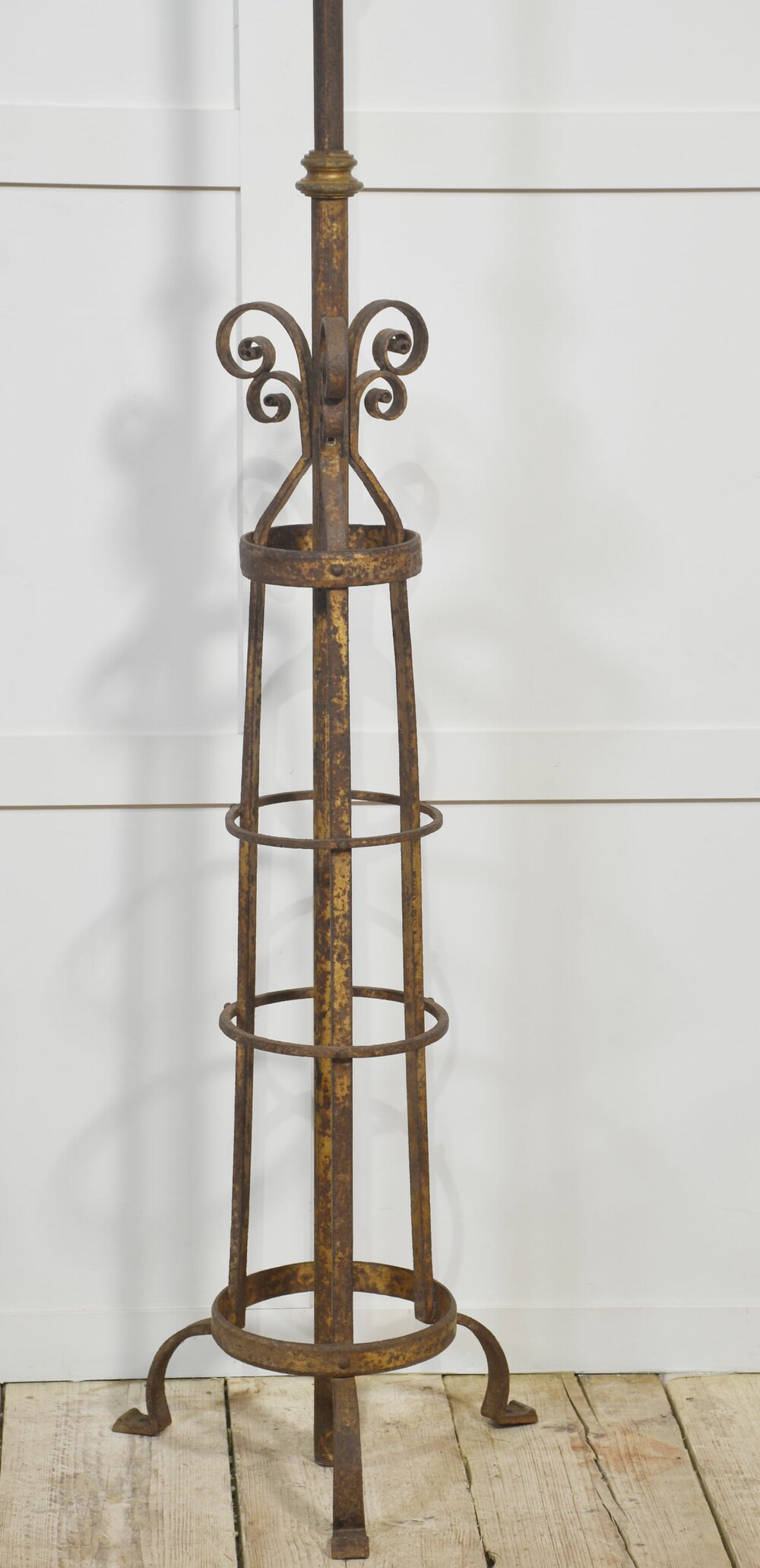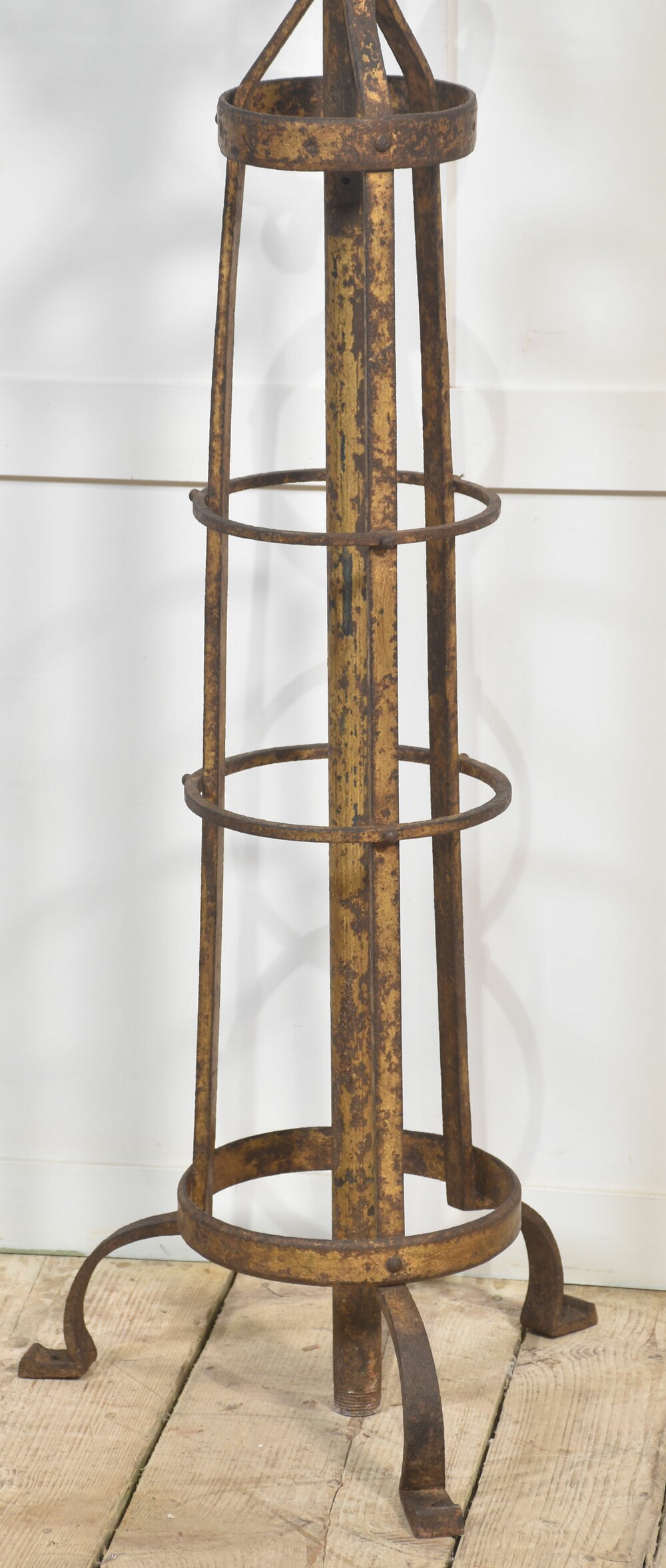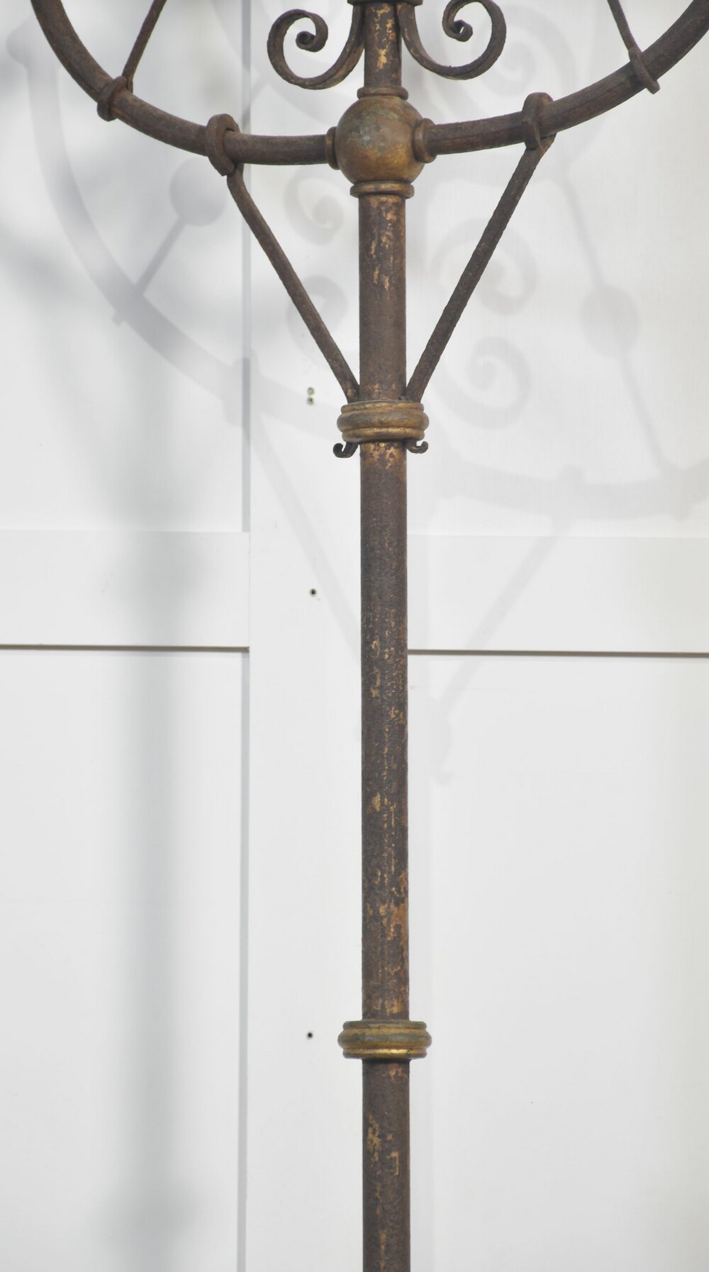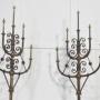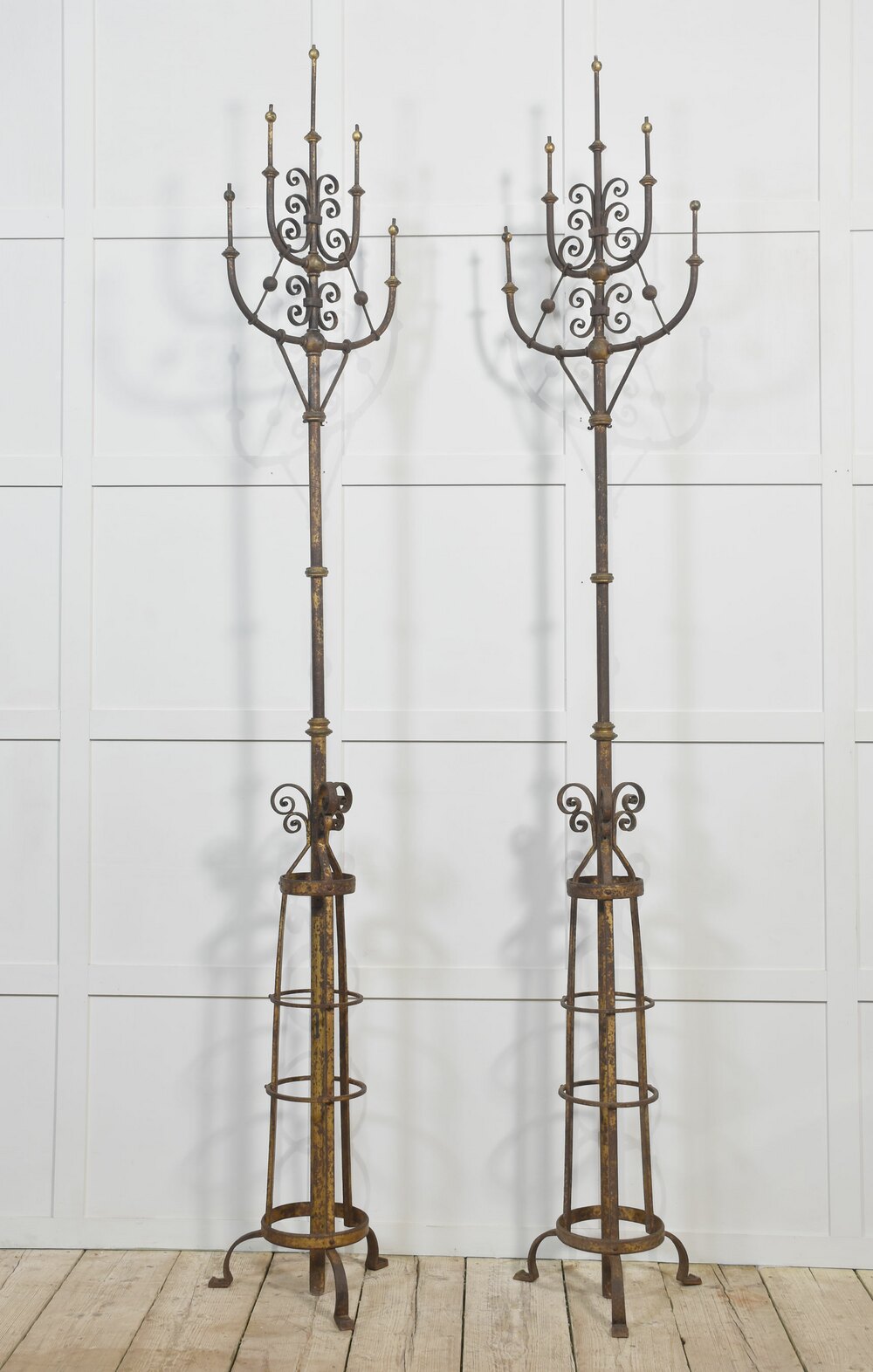 air of Monumental gilded cast iron glass light candelabras, each with five arms having scrolling decoration, raised up on circular stems with ring decoration terminating in shaped feet. (The candelabras can be gas powered however, they have not been tested)
