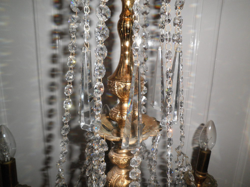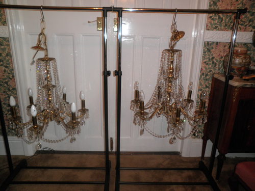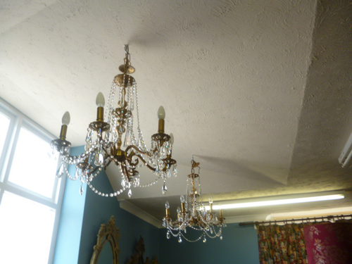 Elegant pair of chandeliers. Six arms dressed with cut glass droplets and swags of glass beads. The chandelier is gilt metal.