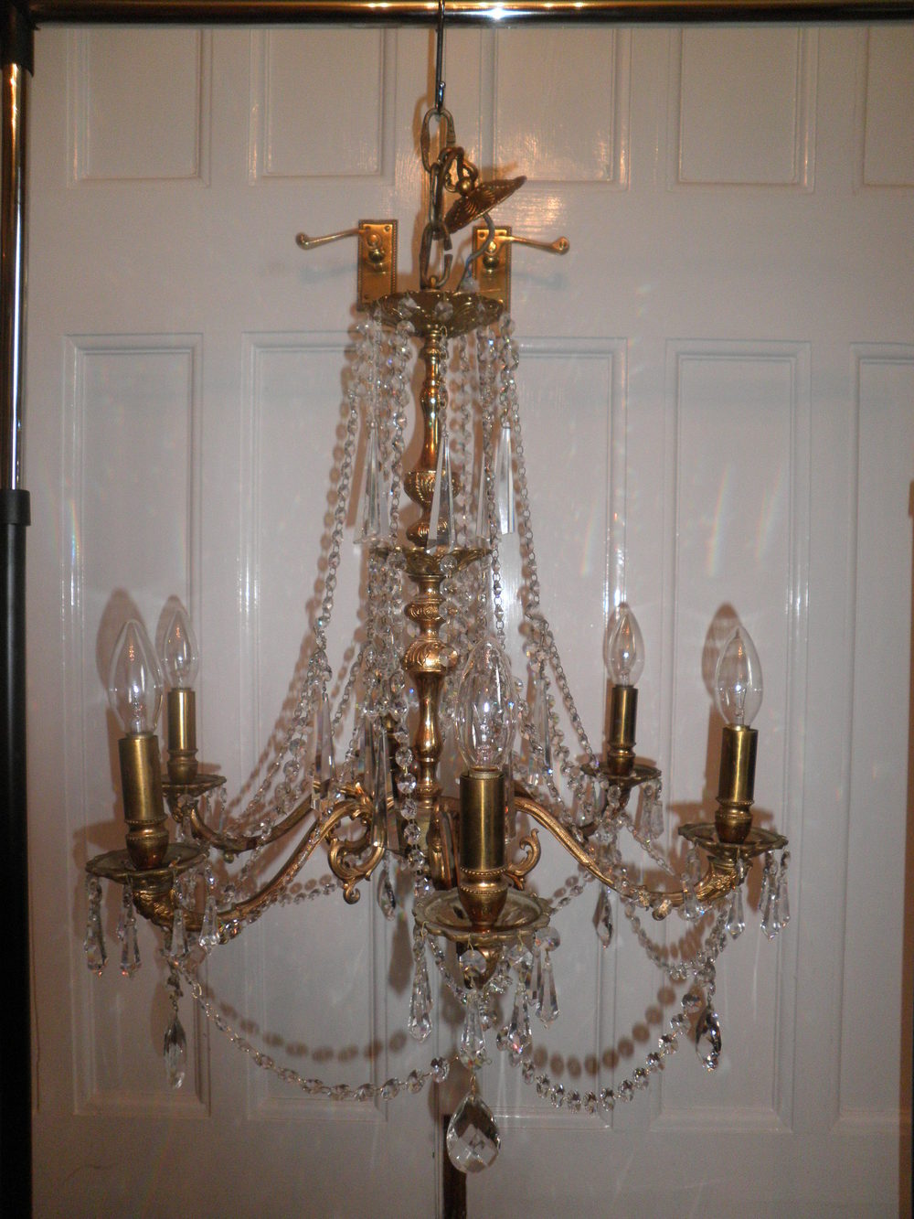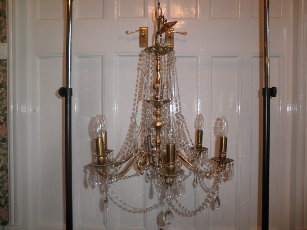 French Gilt Toleware & Ceramic 6 Branch Chandelier
