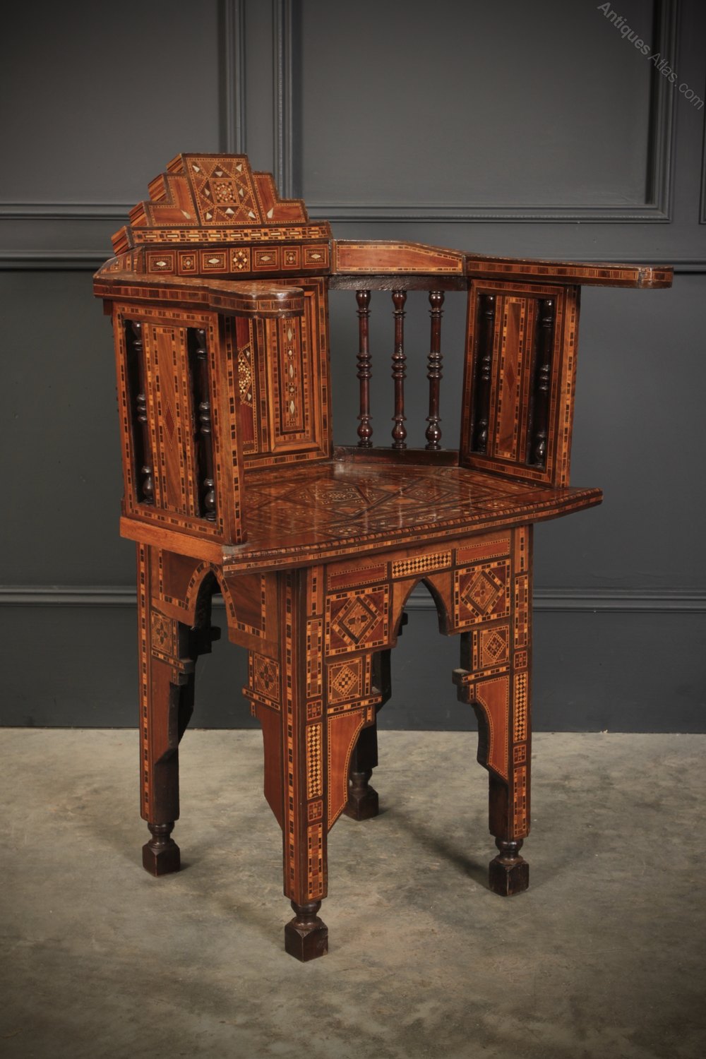 Highly decorated pair of Syrian armchairs featuring intricate marquetry, hand carved detail and mother of pearl inlay with Moorish or Islamic designs. Beautiful geometric patterns throughout the chairs. The arms have turned spindle supports and the legs support a richly decorated seat. The chairs are constructed with mixed woods and radiant grain patterns with contrasting colours.