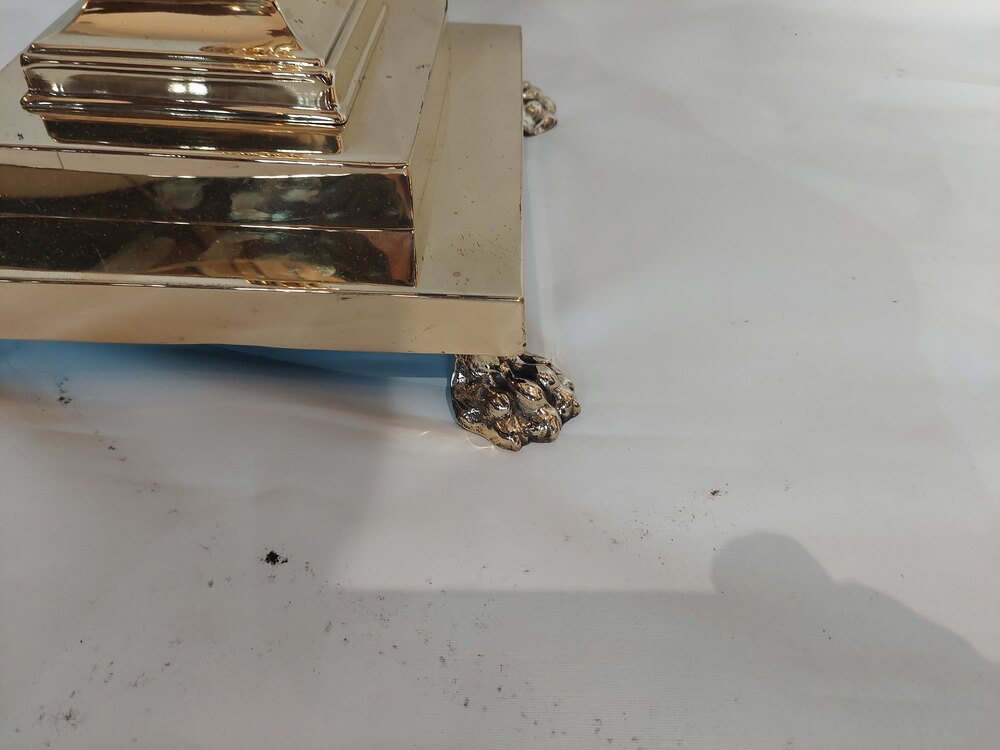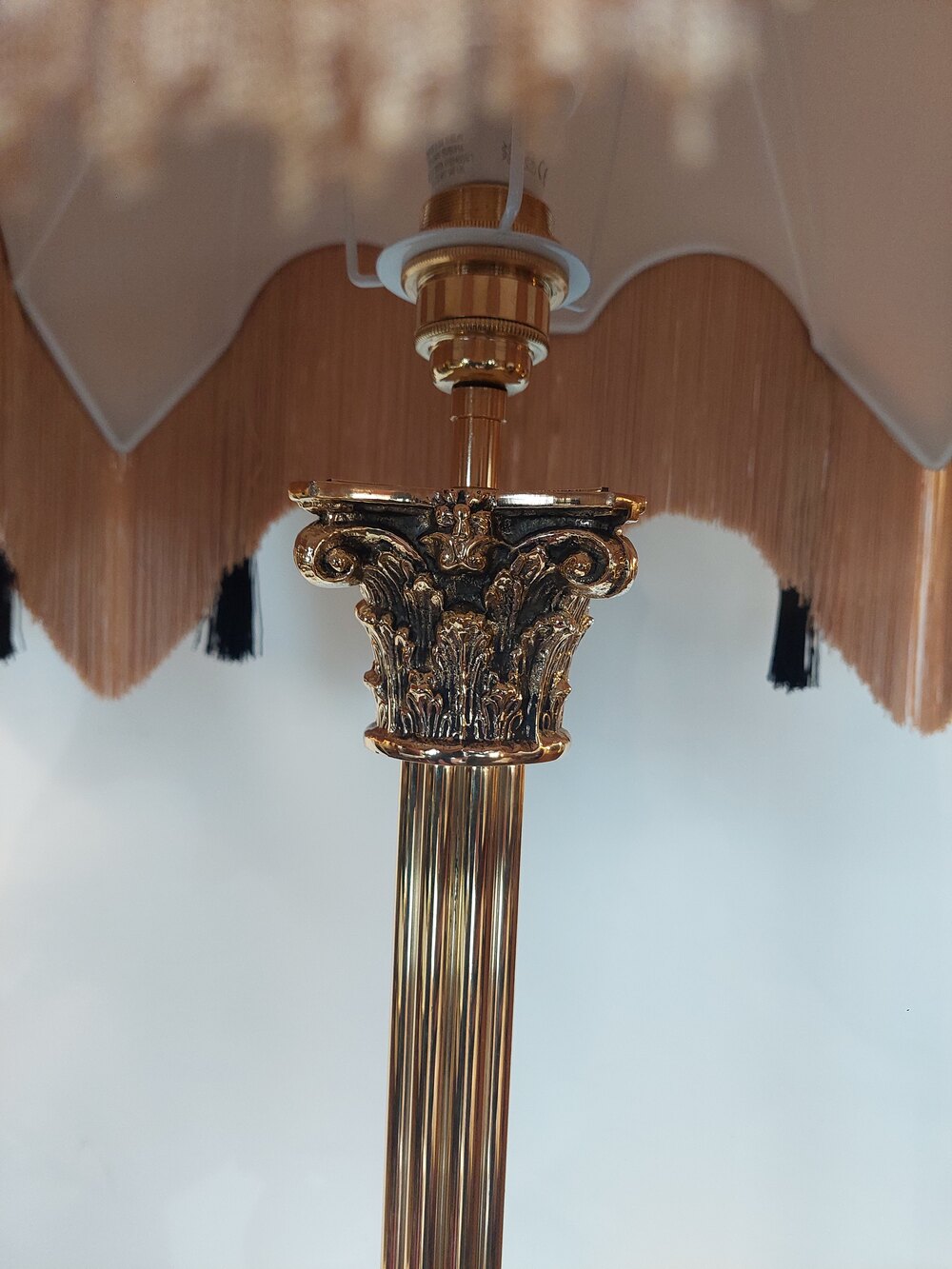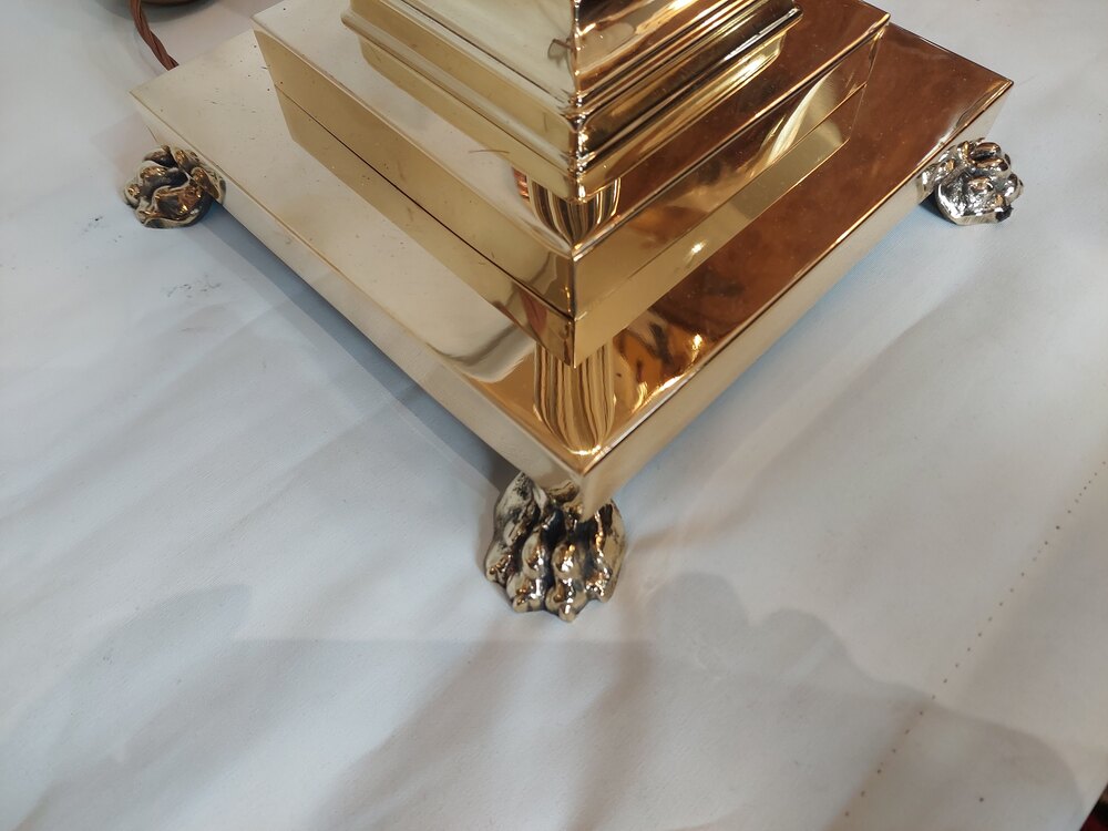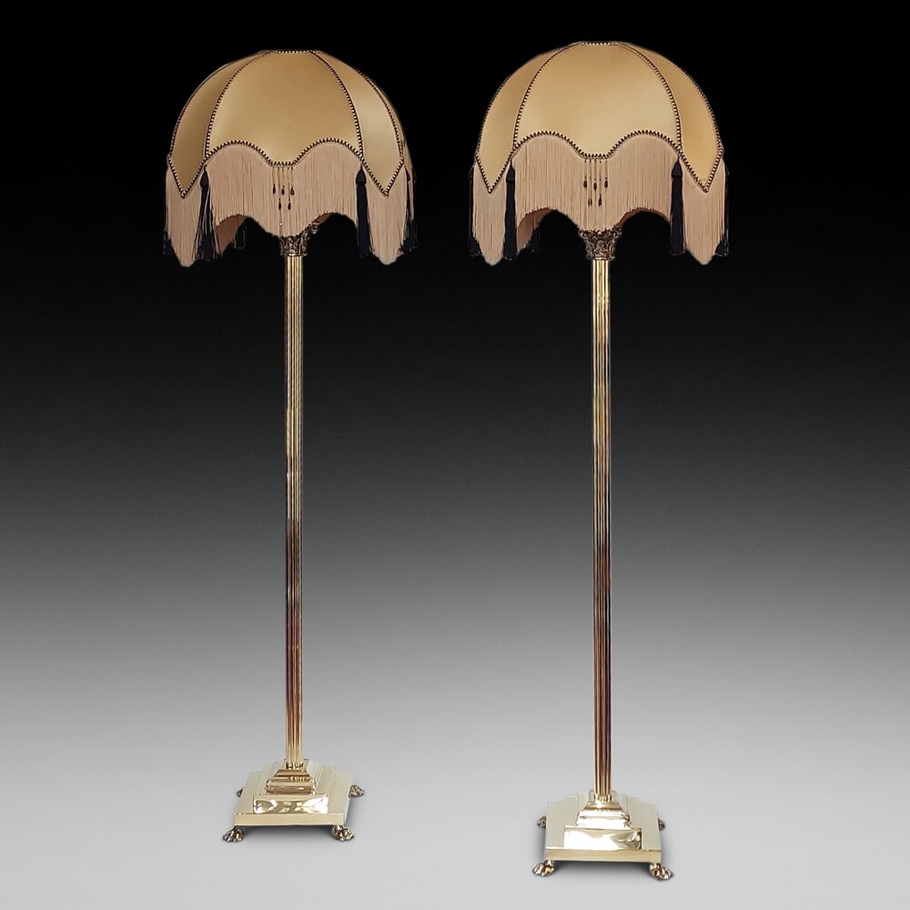 Pair of Early 20thC Cast Brass Standard Lamps - in the form of classical Corinthian Columns on stepped bases supported on lion paw feet - 22" diam x 64"h - all lights and lamps have been rewired with authentic corded flex, fitted with either foot switch or finger clicker switch and are Pat tested - The lampshade(s) are newly handmade silks by the same maker as provides the shades for Downton Abbey