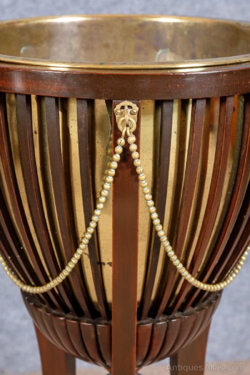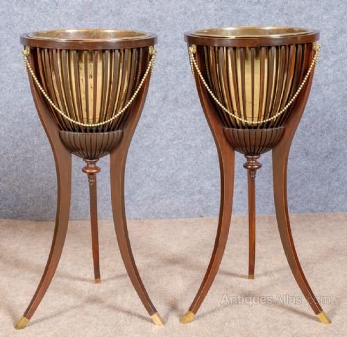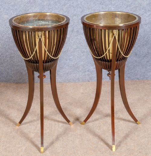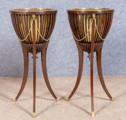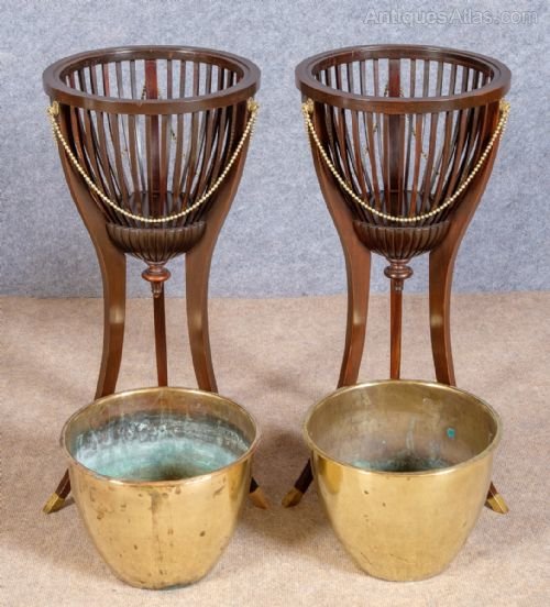 A pair of Edwardian mahogany basket shaped jardiniere stands with original brass liners having decorative draped brass chains and brass capped feet. The original polished brass liners with a few bumps and bruises associated with age and use but perfectly useable. Dimensions:- Height…28.5’’/ 72.5cm. Width & Diameter…13.5’’/ 34.5cm. Delivery to most of U.K. mainland £55.