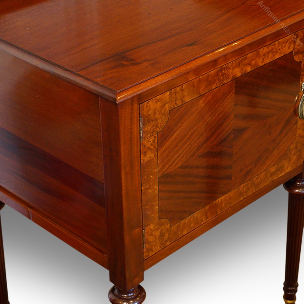 The doors on each cabinet have deep amboyna banding around the edge of the quartered mahogany panel. Each door is fitted with its original brass handle.