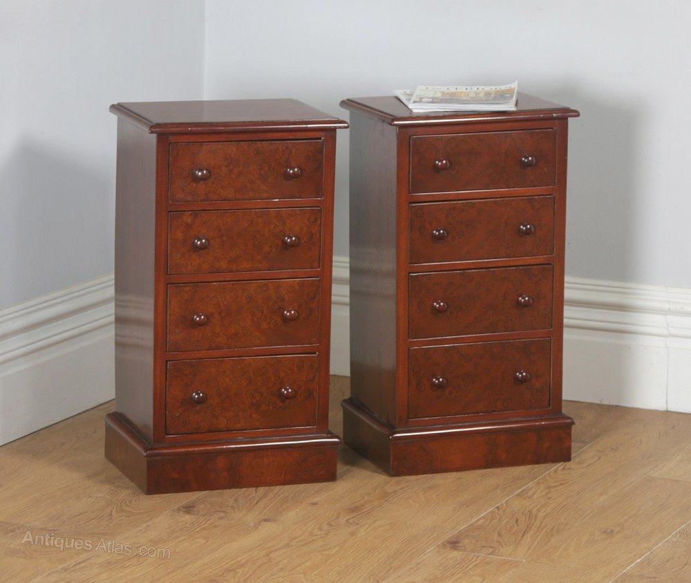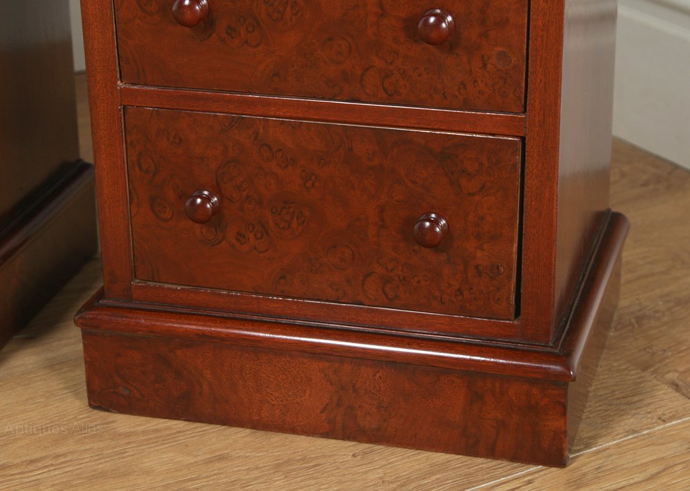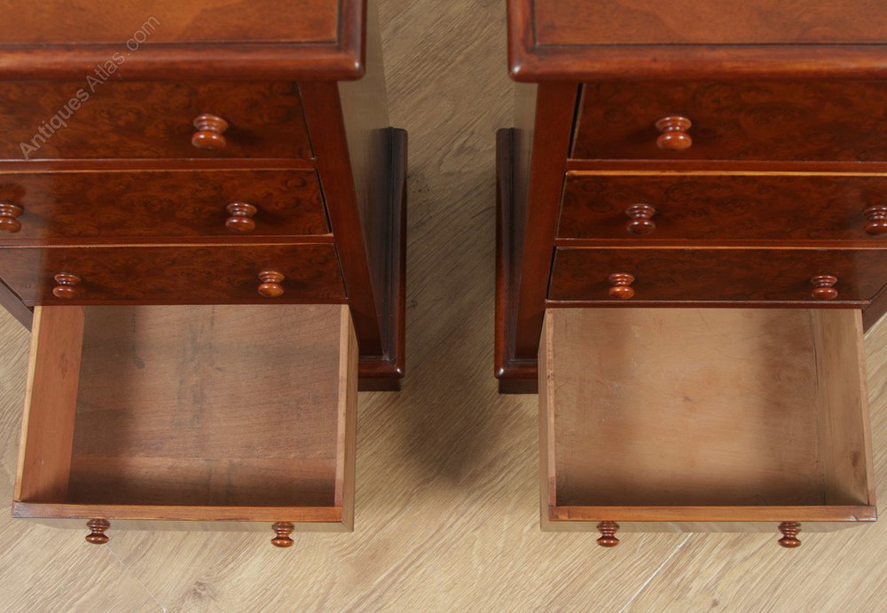 Condition These bedside chests are in good condition having been polished in our workshop. Nominal old use marks to the leading edges, but nothing significant considering the age of the item. There are no cup marks to the tops of the bedsides. Please note, any colour variation to the tops of the bedsides is due to the natural variation in the grain configuration and patination this is not a defect or marks to the polish – this is entirely natural. The drawers are smooth running and close flush to the frame. All drawers retain their original knobs. These bedsides incorporate quality burr walnut veneers a wood which gives a superb colour and patination. They are solid in joint and ready to use.