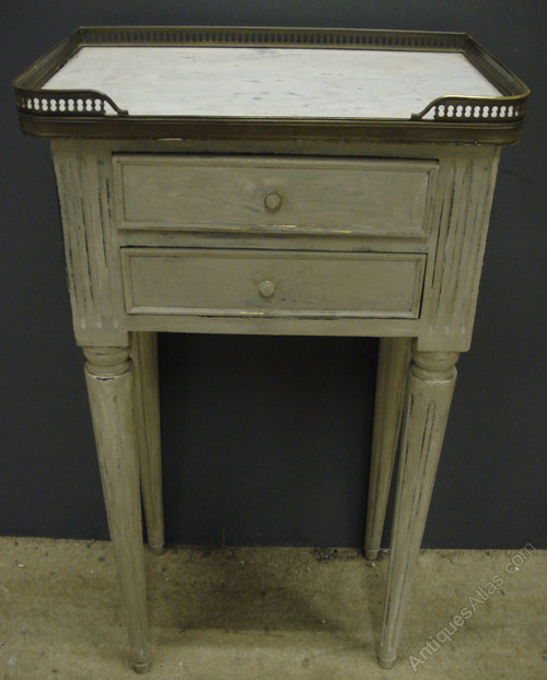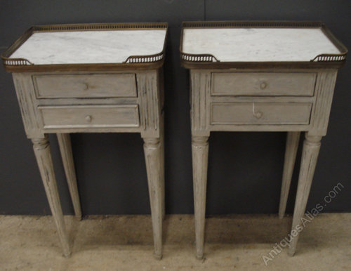 Ref 4957 - Pair of old French worn pale grey painted bedside cabinets. Two drawers. Original white/grey figured marble tops with brass galleries. Circa 1950.