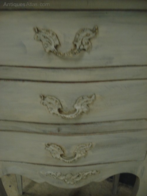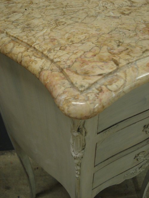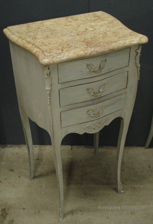 Ref 5378 - Pair of worn grey painted Louis XV style bedside cabinets with original marble tops and original brass fittings. Circa 1950.