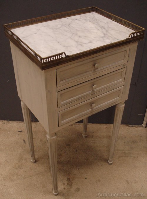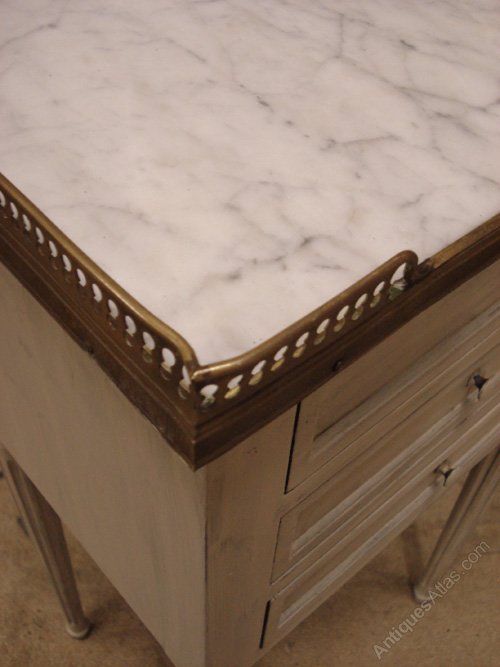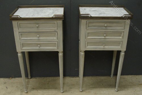 Ref 5456 - Pair of Louis XVI style worn pale grey painted three drawer bedside cabinets with brass galleries and original marble tops. Circa 1950.