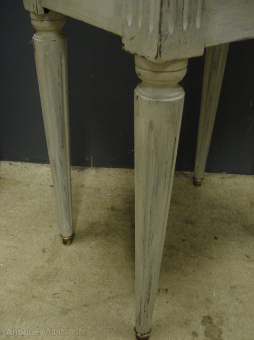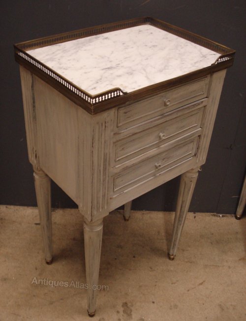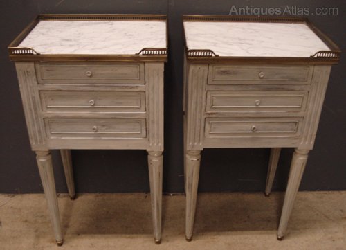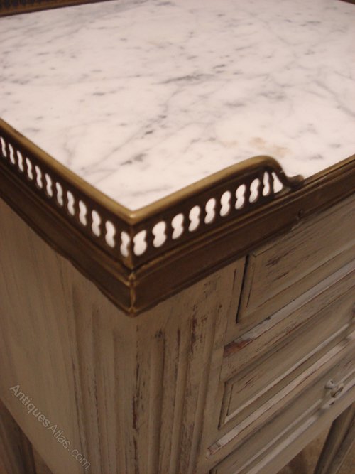 Ref 5502 - Pair of French Louis XVI style distressed grey painted bedside cabinets. Original white/grey marble tops. Original brass galleries. Circa 1950.
