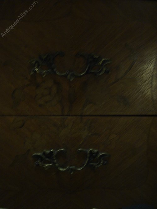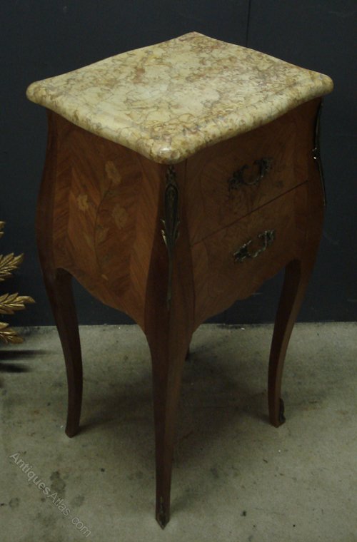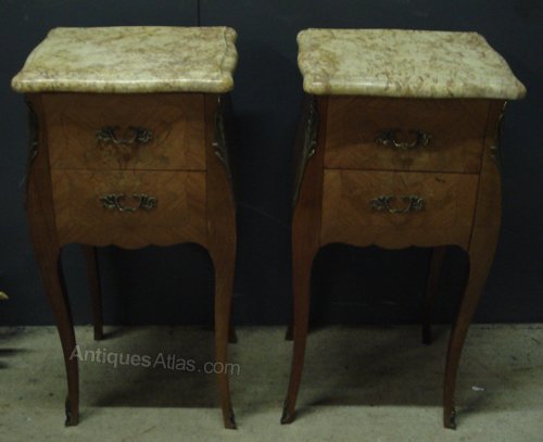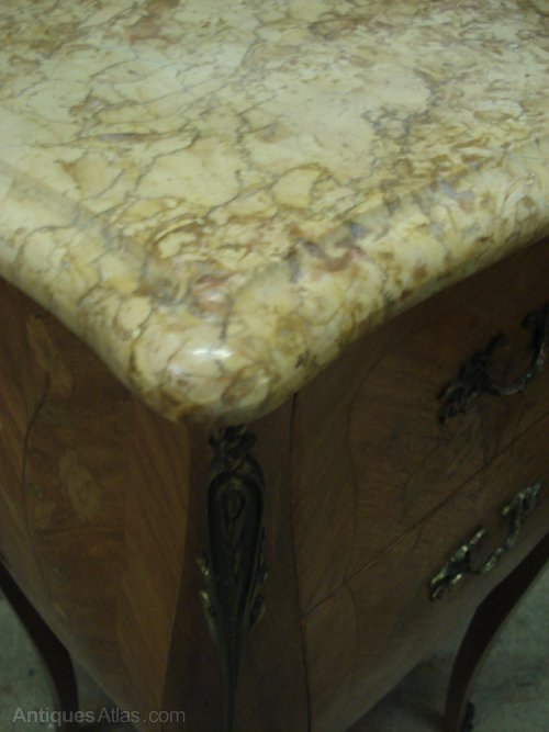 Ref 5554 - Pair of walnut inlaid Louis XV style bedside cabinets with two drawers. Original marble tops. Original ormolu mounts and handles. Circa 1950.