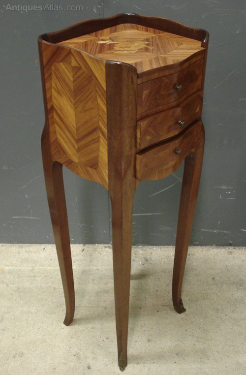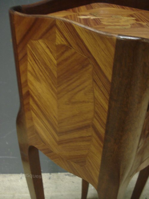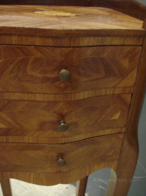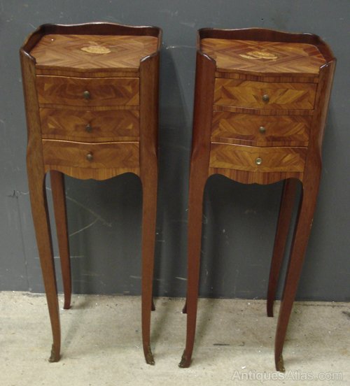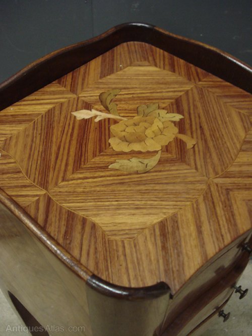 Ref 5861 - Pair of French inlaid bedside cabinets with original drawer knobs and feet mounts. Three drawers. Circa 1950.