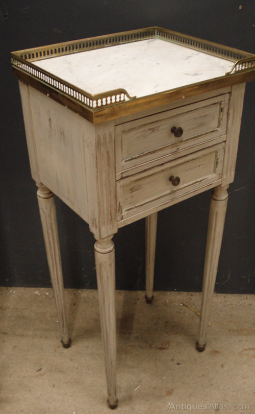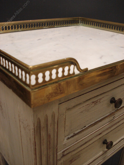 Ref 3922 - Pair of Louis XVI style marble top bedside cabinets finished in worn pale grey paint. Original brass fittings. Circa 1950.