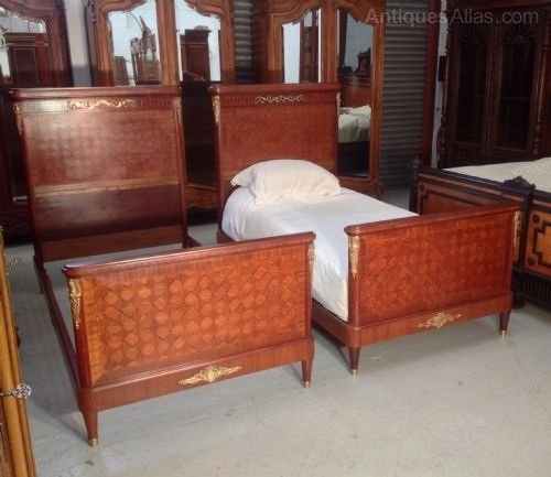 The beds are inlaid with satinwood, mahogany, boxwood,tulipwood etc and adorned with brass ormolu fittings.
