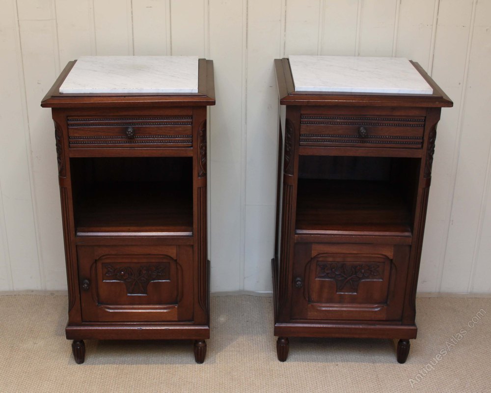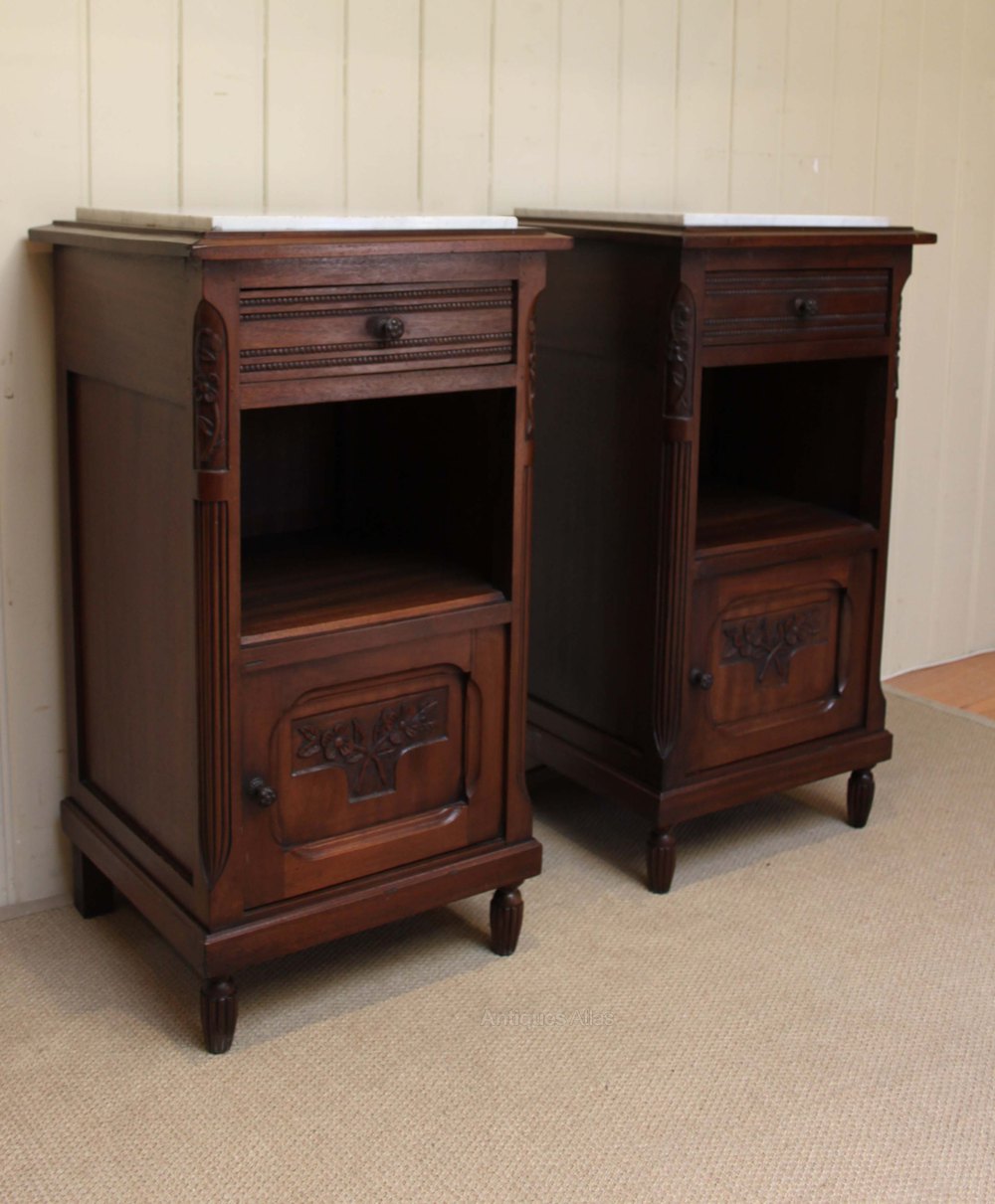 Pair of French mahogany bedside cabinets having marble tops with a single drawer above a cupboard base with a carved detail