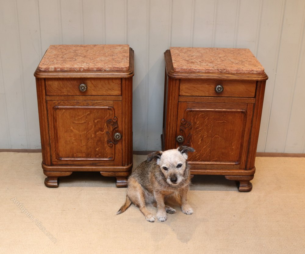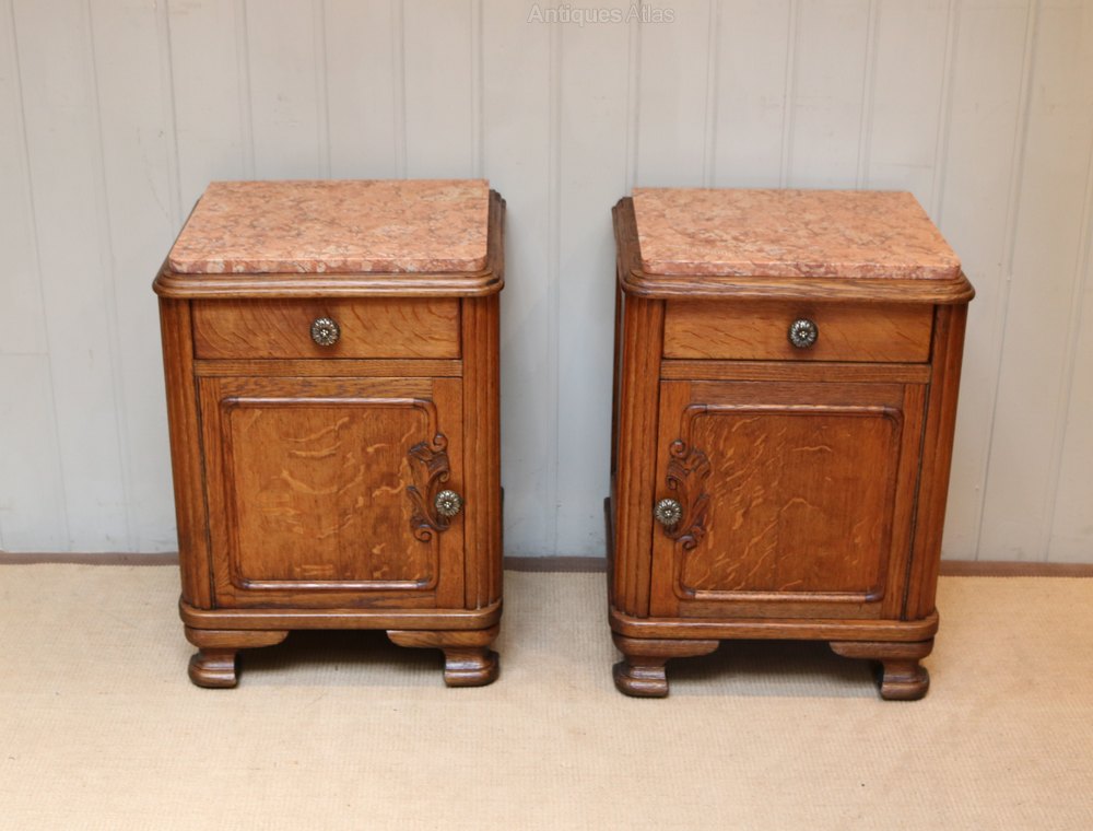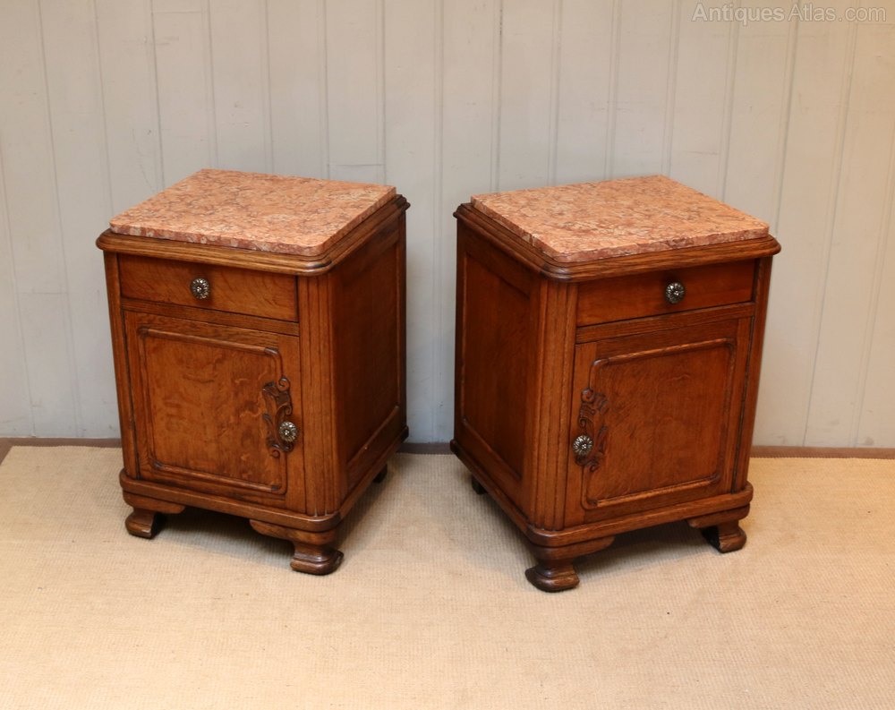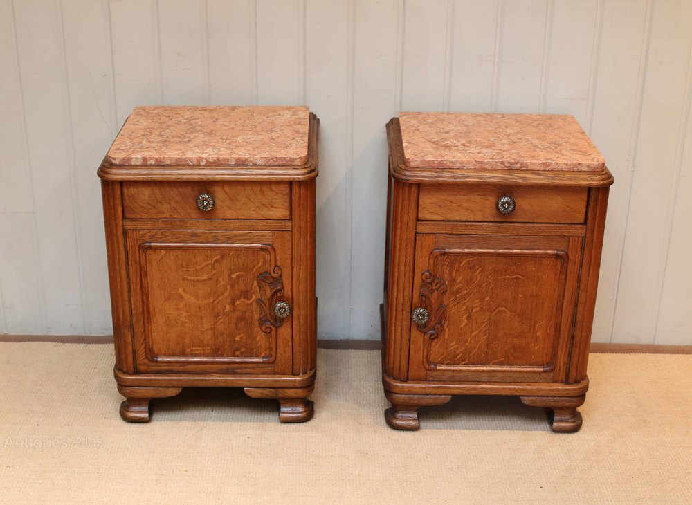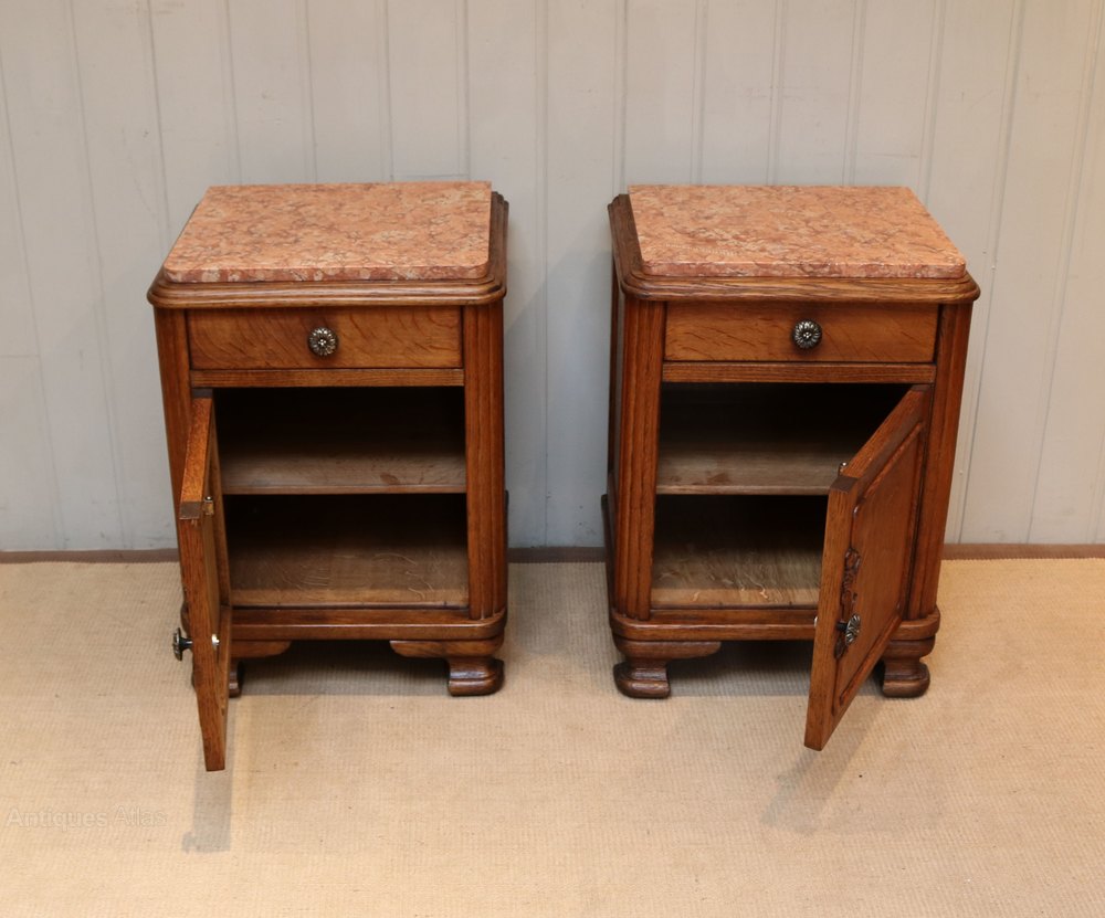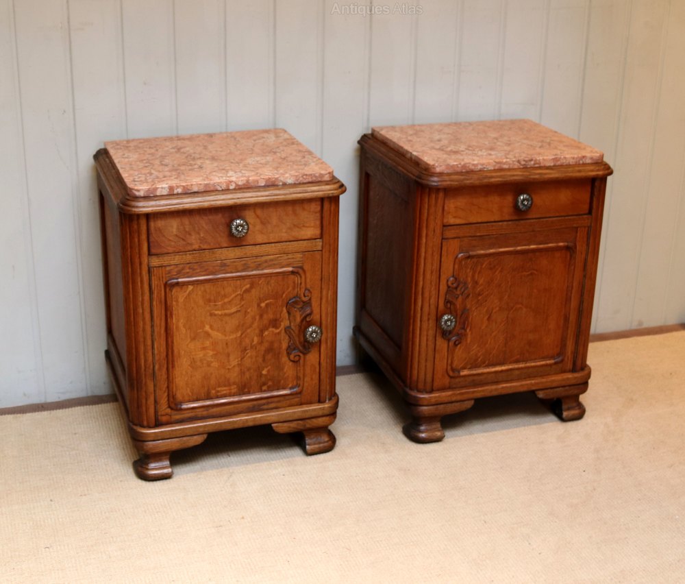 Pair Of French Oak Marble Top Bedside Cabinets