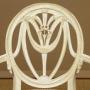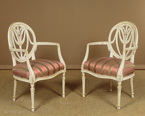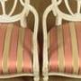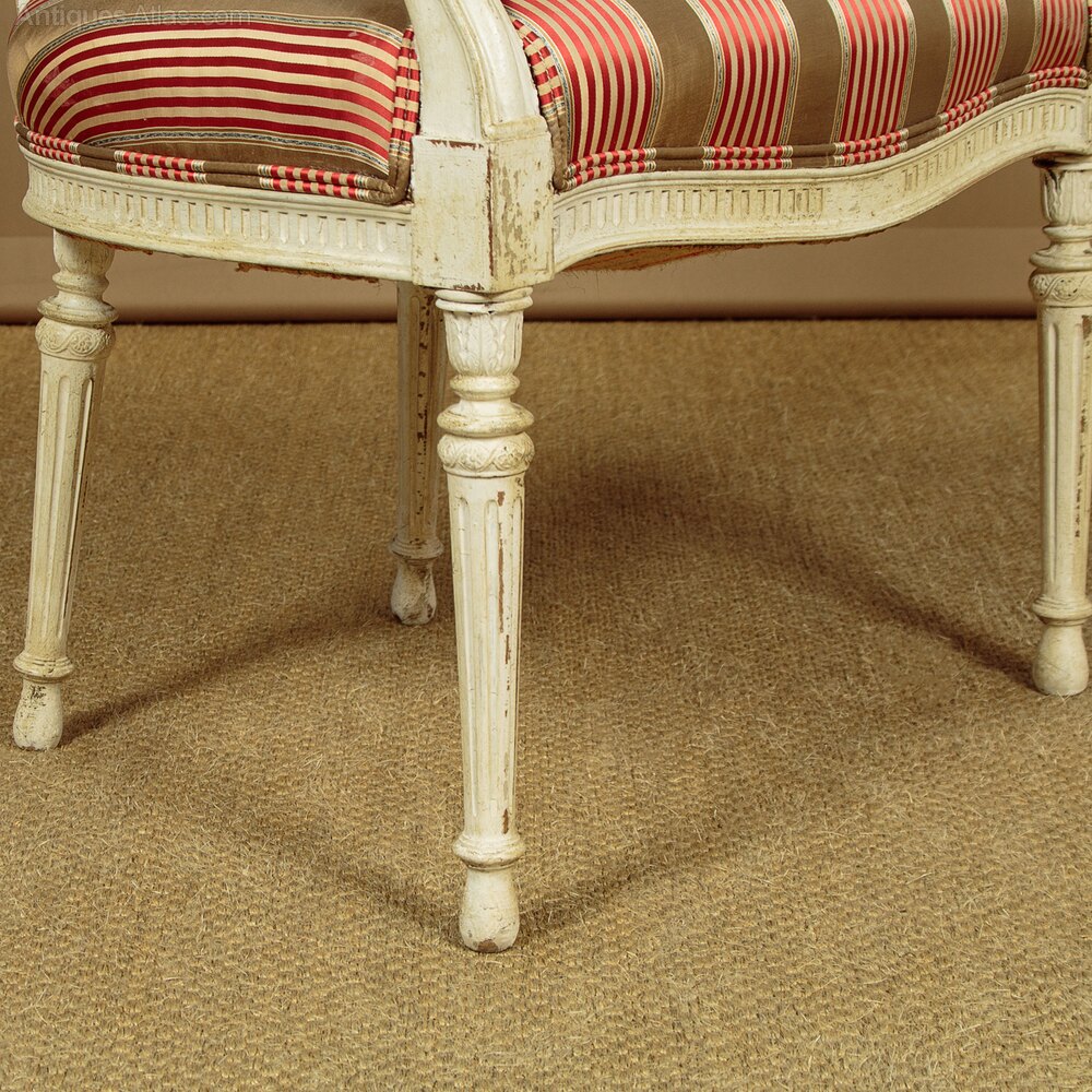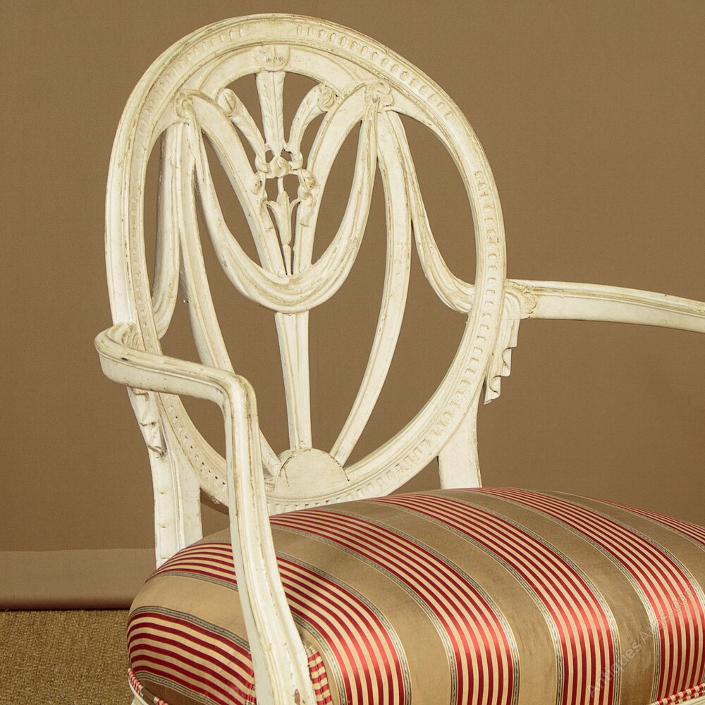 A pair of elegant French carved and painted open armchairs c.1900. Oval back rests carved with a three feathers motif and cloth swags. Slim curving arms on swept supports. Sprung seats upholstered in a Regency stripe silk fabric. Shaped and fluted rails below the seat and raised on turned and fluted legs with carved detail the tops front and rear. Some obvious wear to the paintwork which is rubbed through in places to reveal grey underpainting and the hardwood frame below. Serviceable covers with some small watermarks and minor wear. Solid and sturdy with good firm springs in the seats.