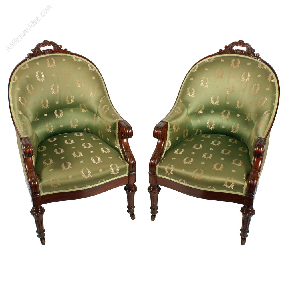 The chairs have tapering fluted front legs with casters and a scrolling arm rest above.
