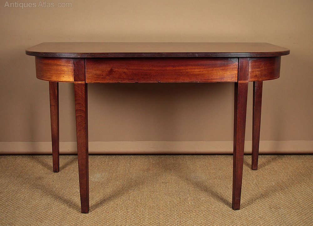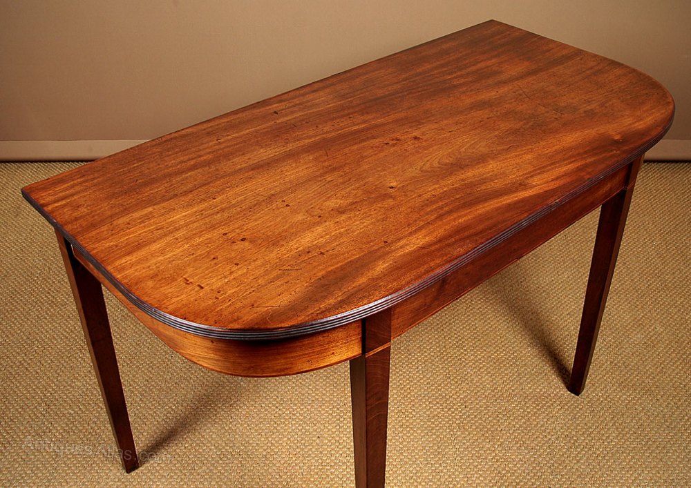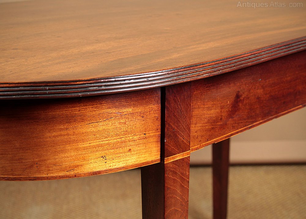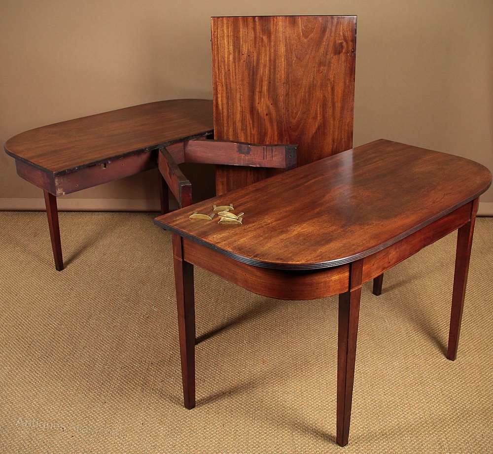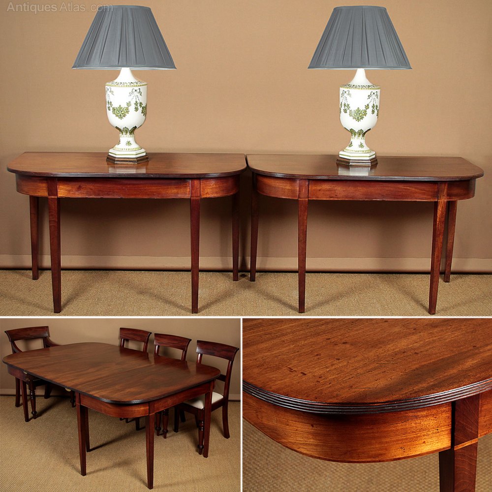 Elegant pair of George III mahogany side antique tables c.1800. Bow front tables with solid mahogany tops of particularly good colour and grain with reeded edges. Over an apron with inlaid boxwood stringing to the edge and raised on tapering square legs in solid mahogany. Ideal as a pair of console tables or can be pushed together to make a square table for four. Or with the addition of the original extra leaf resting the hinged legs at the rear of one of the tables and locked together with brass clips, it makes a small dining table for eight people (length 74″). Excellent original colour and condition, cleaned and waxed in our workshops.