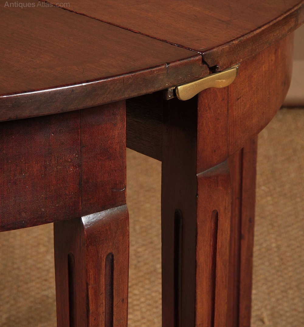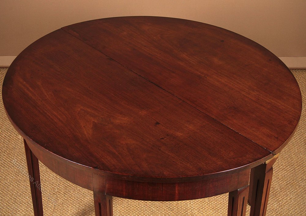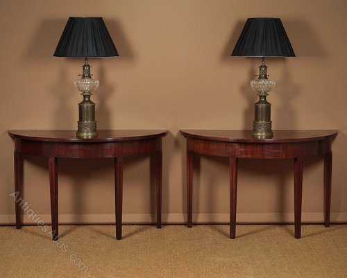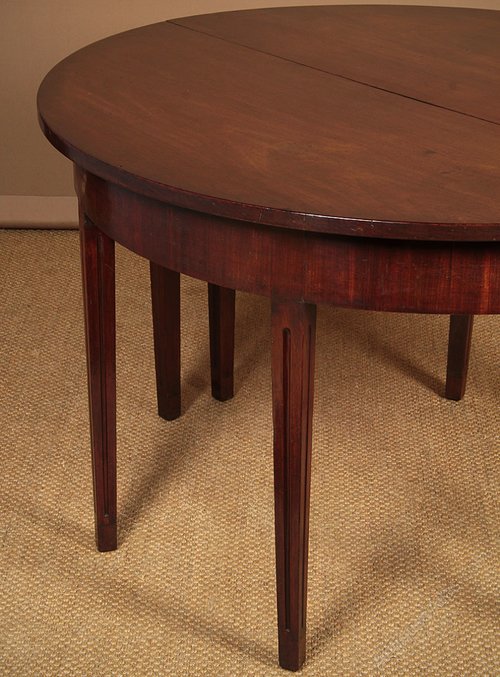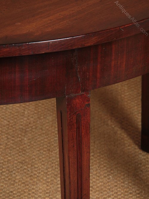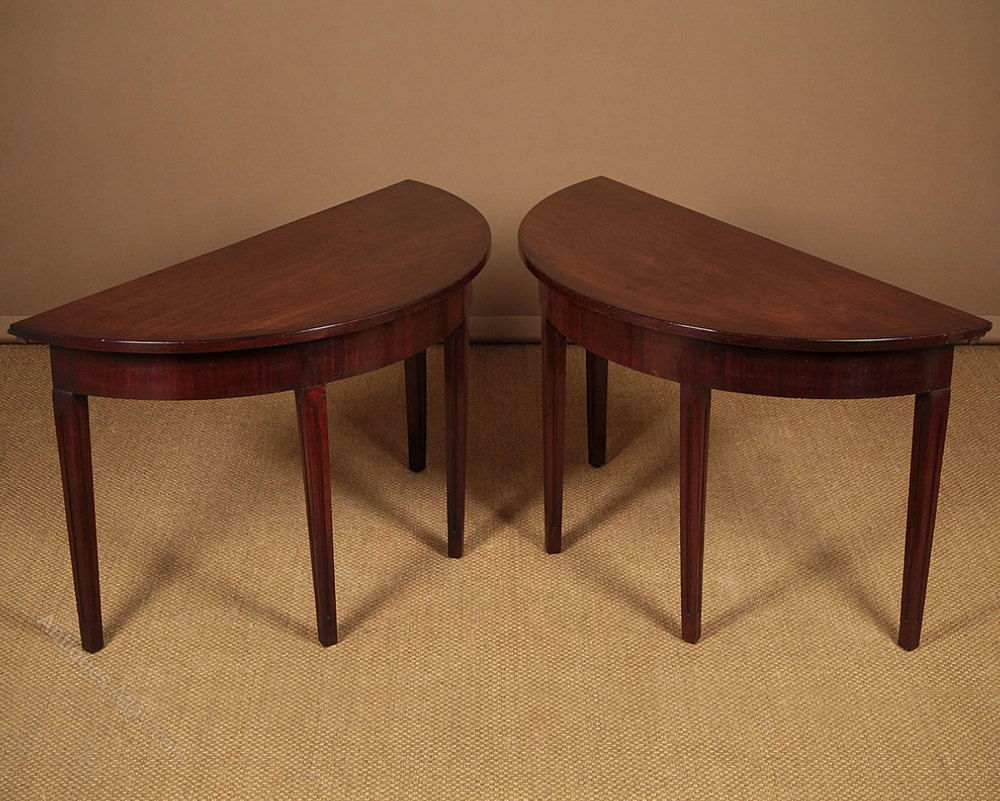 Pair of George III mahogany side antique tables c.1810. Semi circular tables with superb solid mahogany tops over crossbanded aprons. Raised on tapering square legs with flutes to the front and sides. Ideal as a pair of console tables or can be pushed together to make a circular table for four held together with brass clips. Repairs to the feet and at the top of one of the legs. Otherwise good condition, solid and sturdy with particularly good colour. Cleaned and waxed in our workshops.