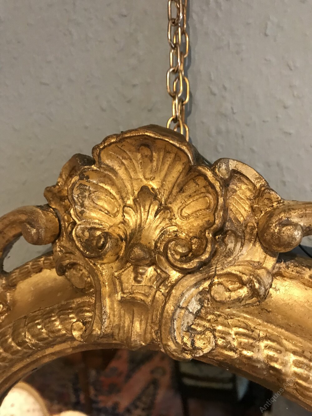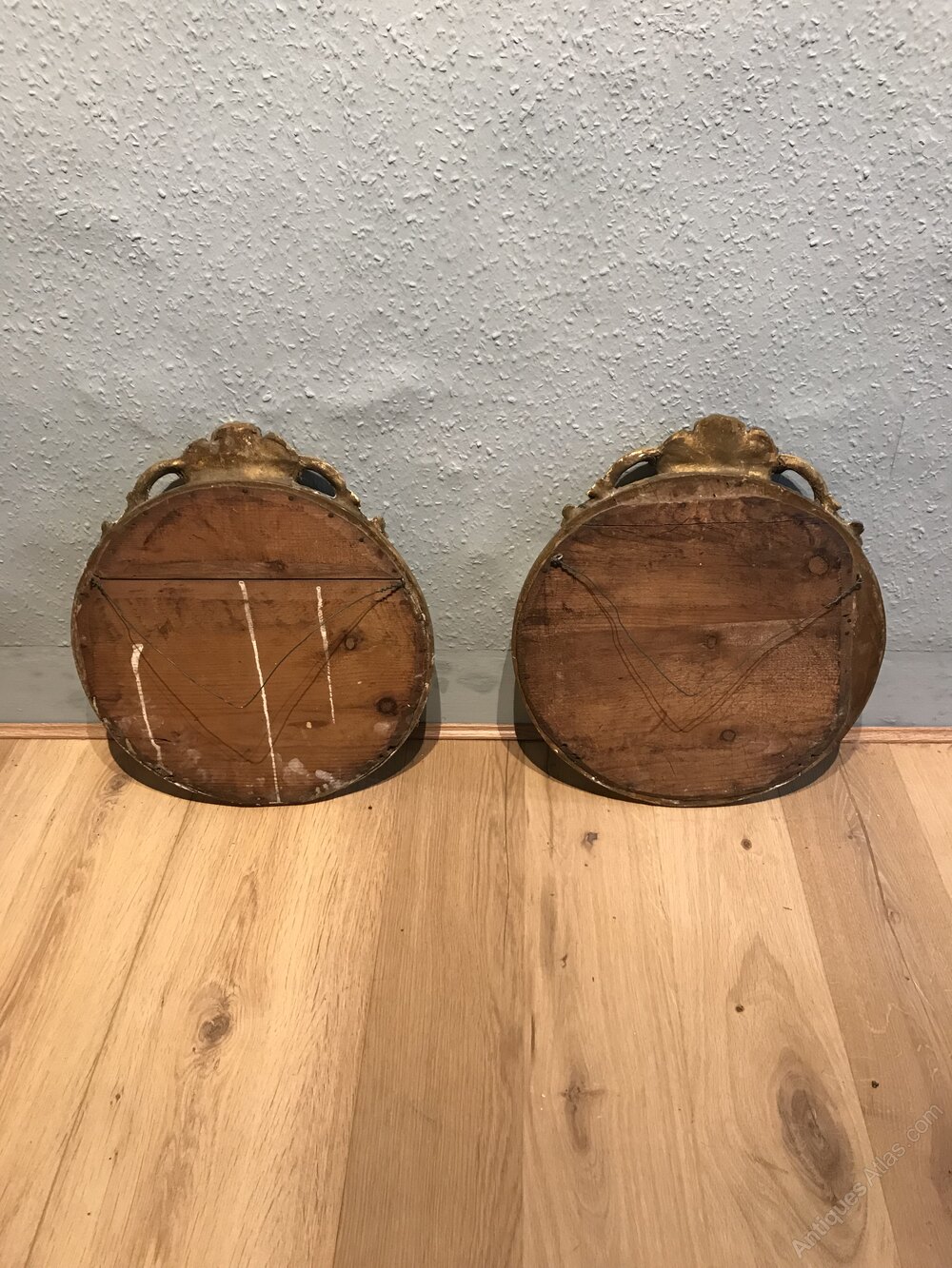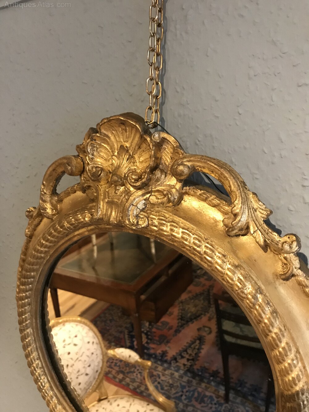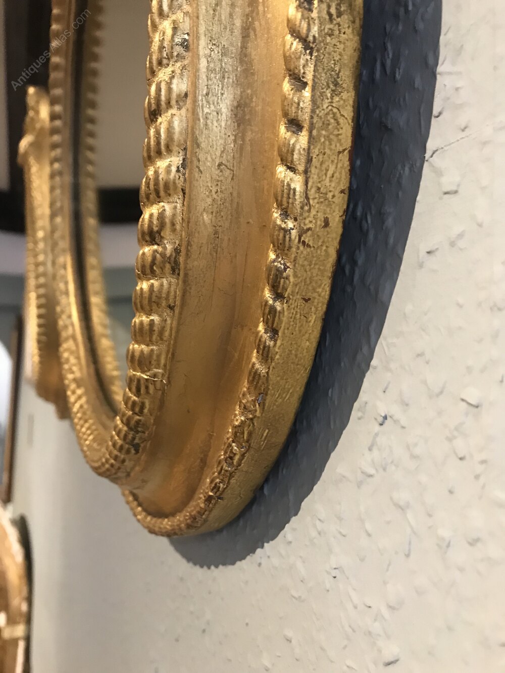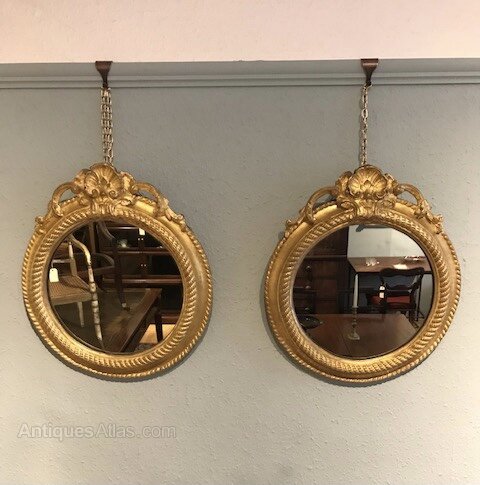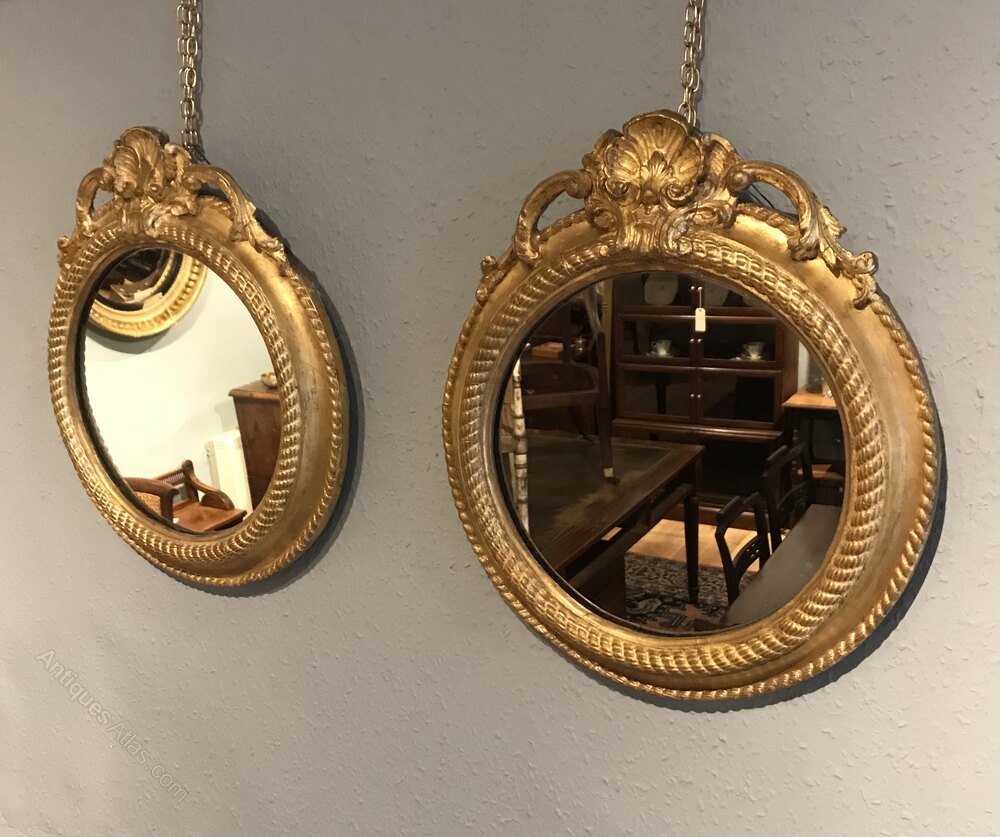 An attractive pair of matching gilt mid 19th century English round mirrors. The gilt mirrors feature a rope twist decoration, dragooning moulding to the perimeter with a cartouche cresting to the top. Both mirrors have the original mirror glass, and the back boards have never been removed, both mirrors are in very good condition.