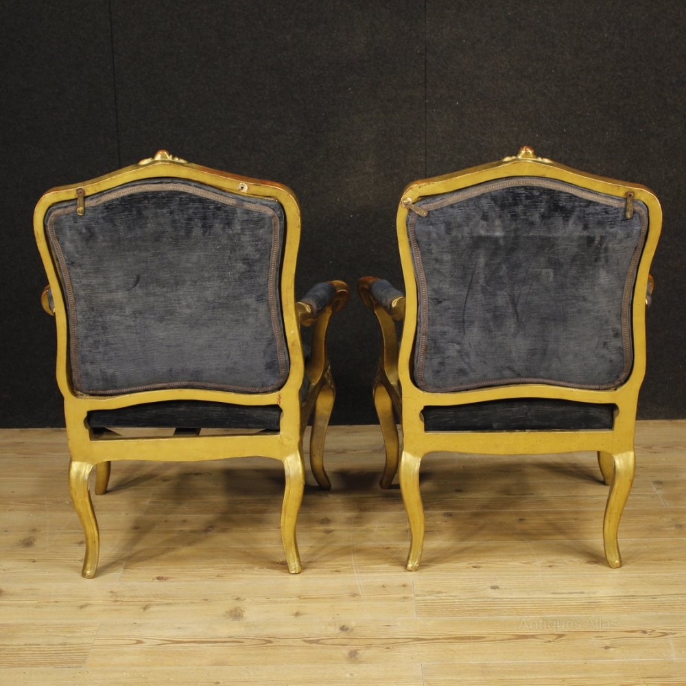 Pair of Italian 19th century armchairs. Furniture in richly carved and gilded wood of excellent quality. Removable seats and backs covered in velvet with some signs of wear. Wooden armrests adorned with velvet insert (see photo). Very elegant furniture, for antique dealers and interior decorators, part of a set (request the bulk price if available). They show some signs of wear and some small drops of color, overall in a good state of conservation. Seat height 44 cm.