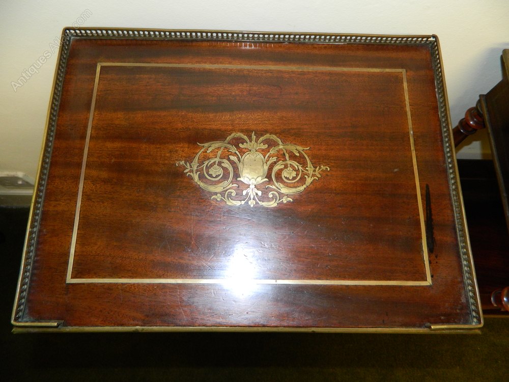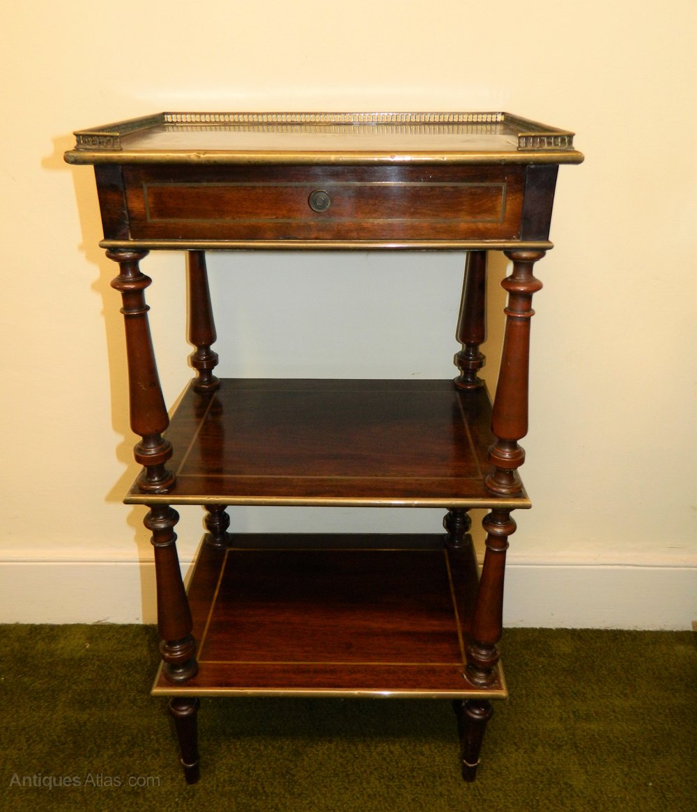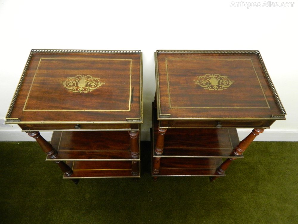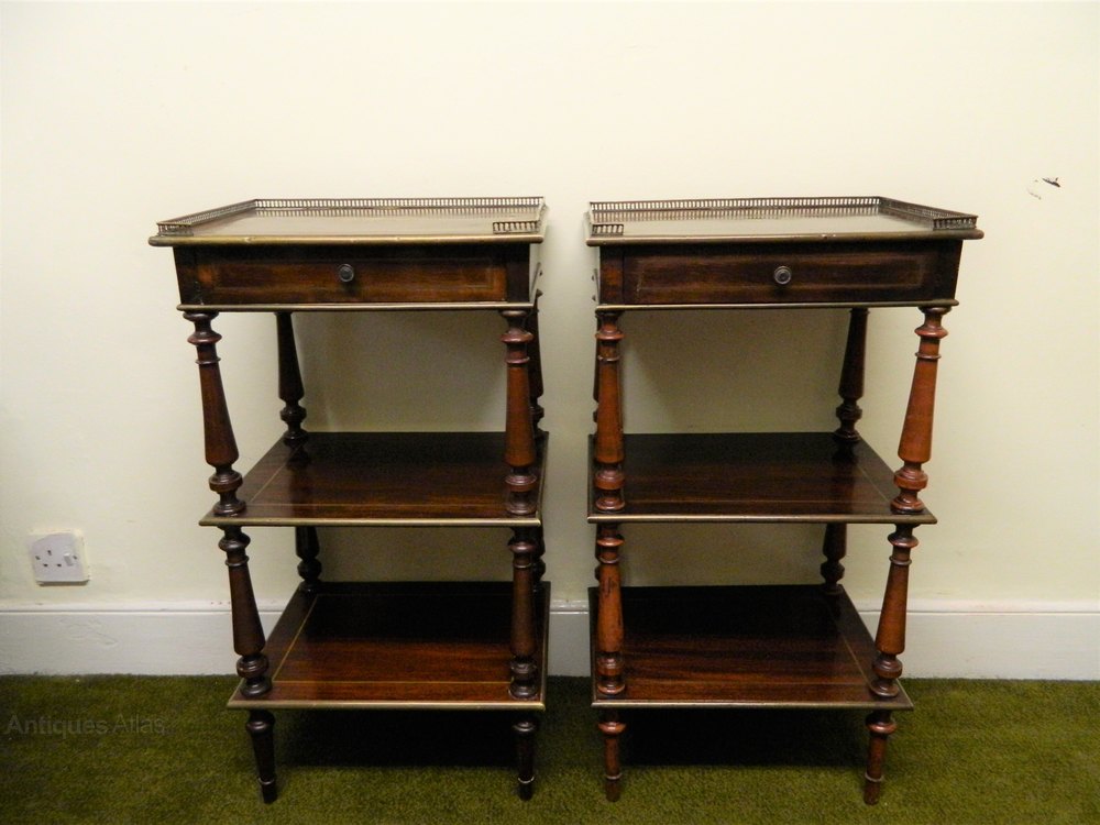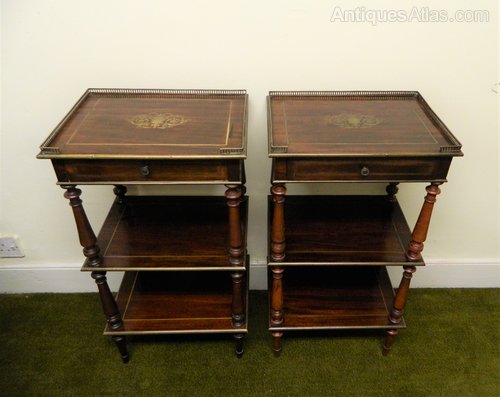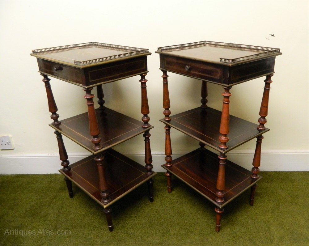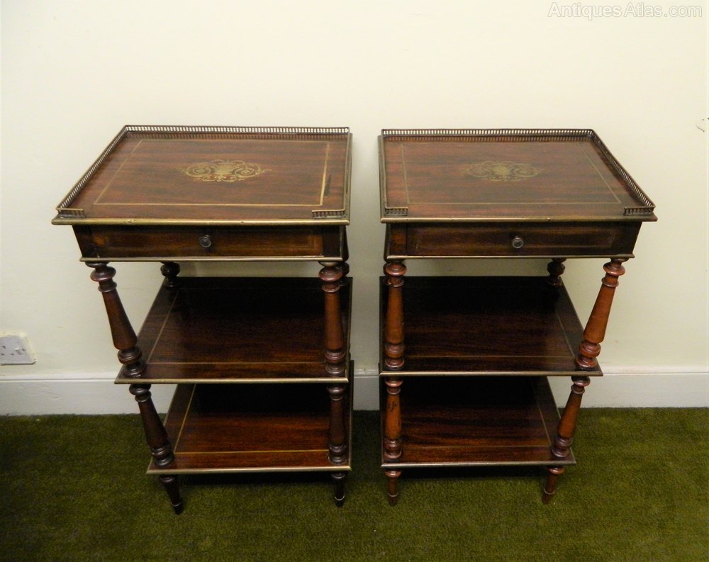 lovely quality pair of goncalo alves etagere / side antique tables with pierced brass galleries and wonderfully intricate brass inlay to the tops, frieze drawers and brass stringing and edging to each tier.