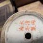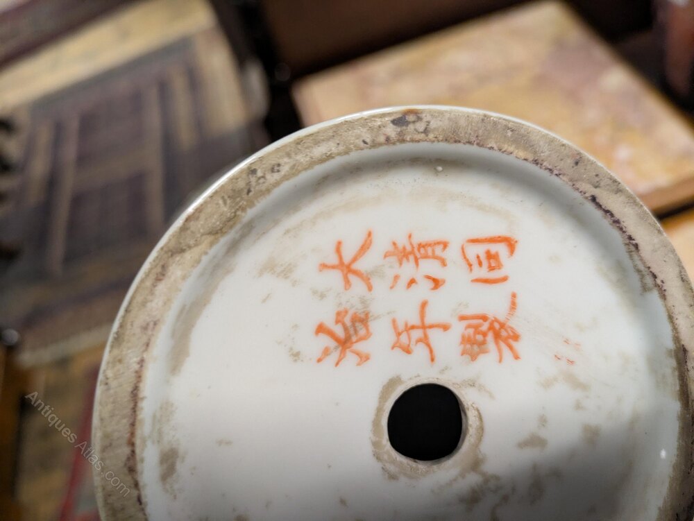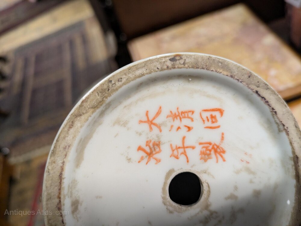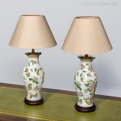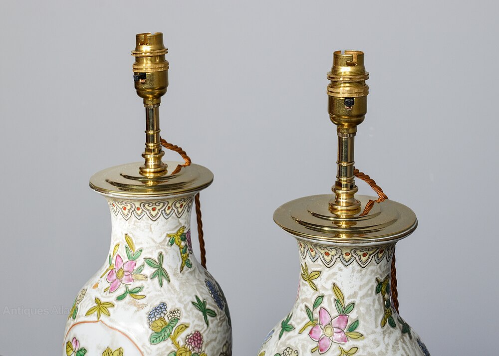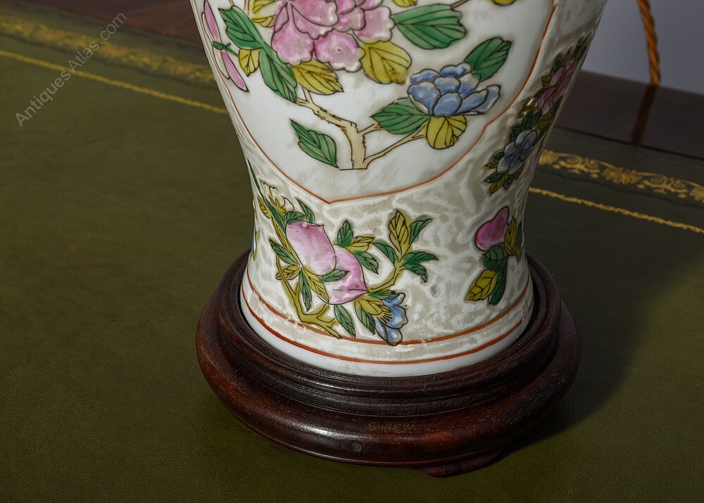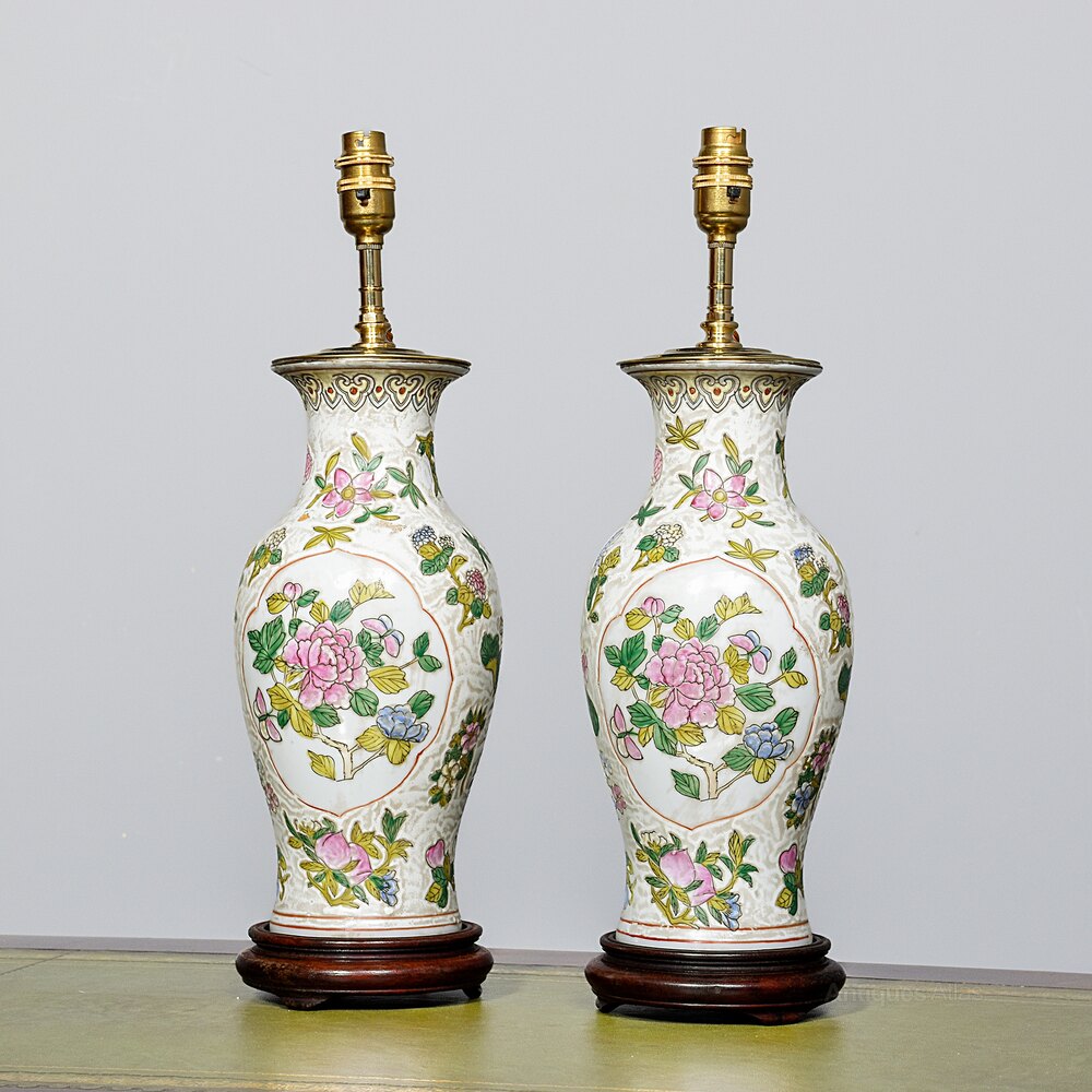 Circa 1910 with alterations. Pair of hand-painted Chinese vases converted to lamps. The vases with Chinese inscriptions beneath have a vasiform body with panels of Famille rose carnations and Famille verte leaves and with new brass light fittings and silk-covered electrical cords. On original wooden stands.