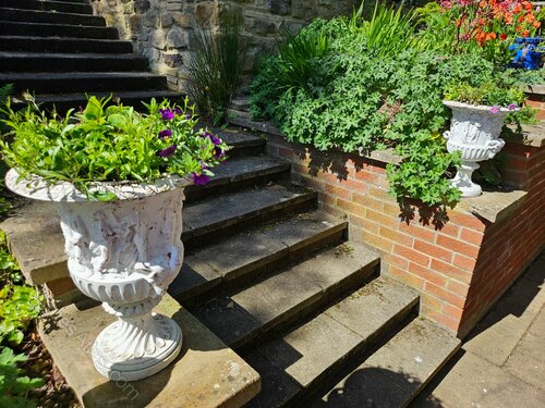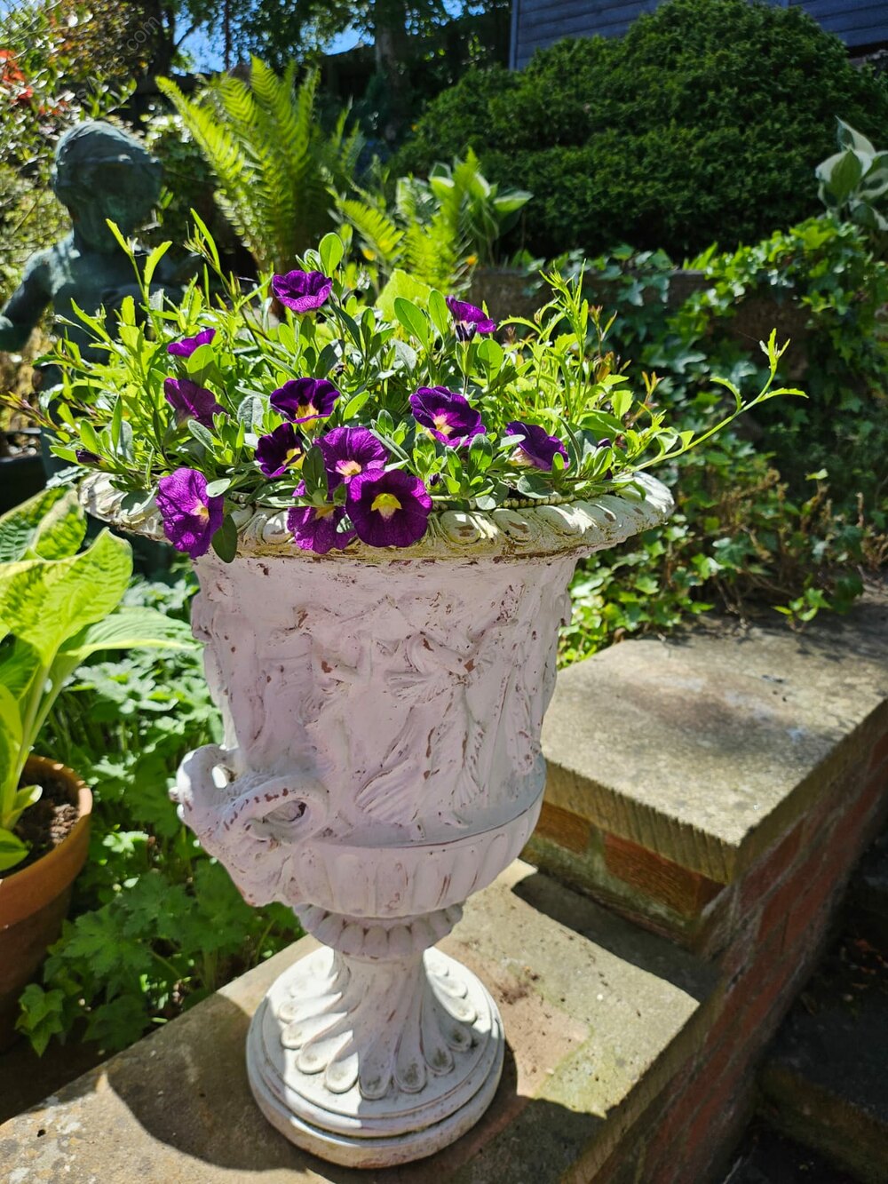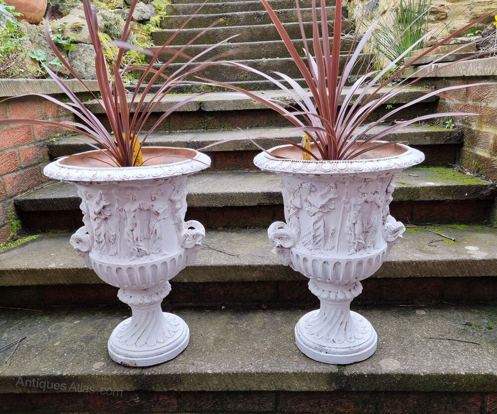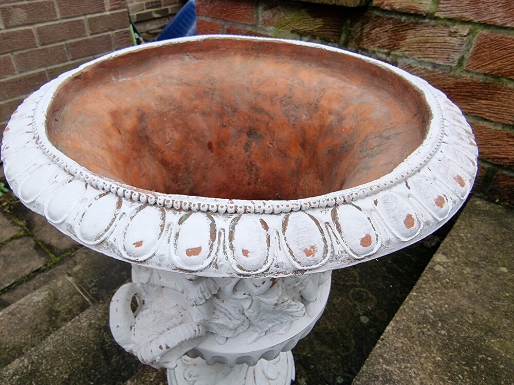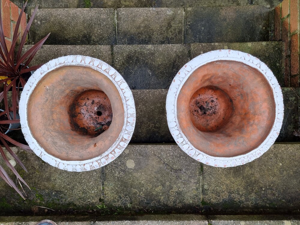 A pair of handsome mid 20th Century terracotta urns, great condition, chalky white patina. Ready for the garden or conservatory. Very decorative.
