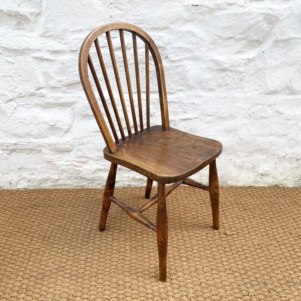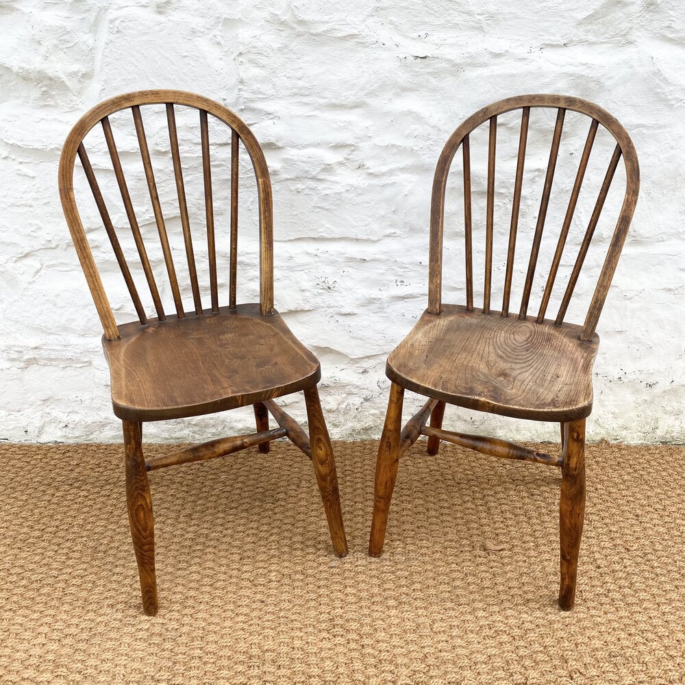 A beautiful and true pair of 19thC hoop back Windsor farmhouse kitchen dining chairs in exceptional original condition. Standing at full height with outstanding colour and patina and wonderful grain. A truly beautiful pair of chairs os highly sought after and rate simple traditional form.