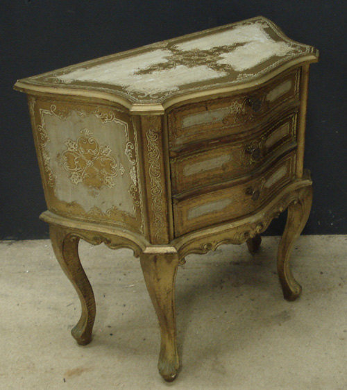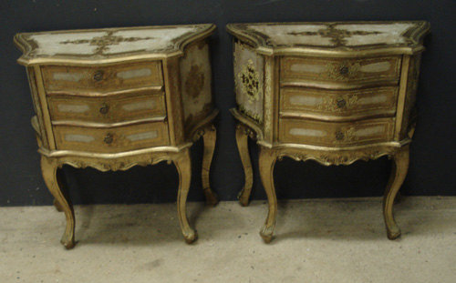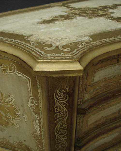 Ref 3744 - Pair of Italian 3 drawer cabinets finished in original cream paint with gilt decoration. Circa 1970.